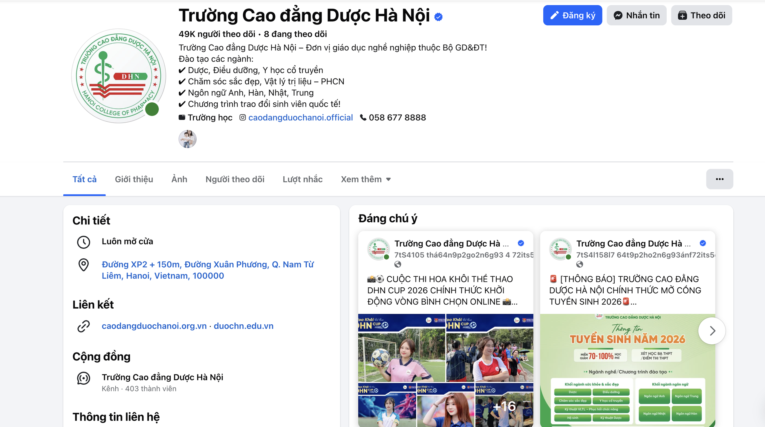 Hai fanpage mang tên Trường Cao đẳng Dược Hà Nội với hình thức thể hiện khác nhau; trong đó một trang có tích xanh, một trang không có tích xanh. Logo của hai cơ sở cùng mang tên Trường Cao đẳng Dược Hà Nội có thiết kế tương đồng nhưng vẫn tồn tại một số khác biệt về chi tiết.