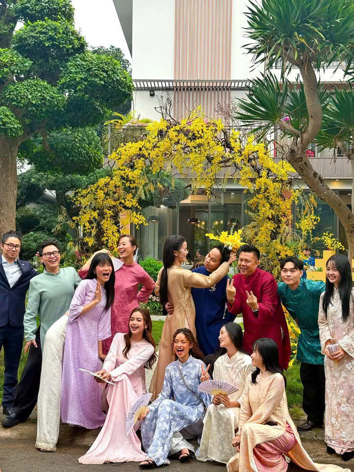 Diện áo dài truyền thống, Hương Ly khoe vẻ đẹp dịu dàng, đằm thắm - đúng tinh thần cô dâu trước thềm ngày trọng đại. Ông xã của Hương Ly cũng gây chú ý với trang phục áo dài nam lịch lãm, tạo nên sự đồng điệu và ấm áp khi cả hai xuất hiện cùng nhau. Không gian xung quanh được trang trí nhẹ nhàng, nhiều hoa tươi và sắc màu truyền thống, mang lại cảm giác bình yên và thân thuộc.