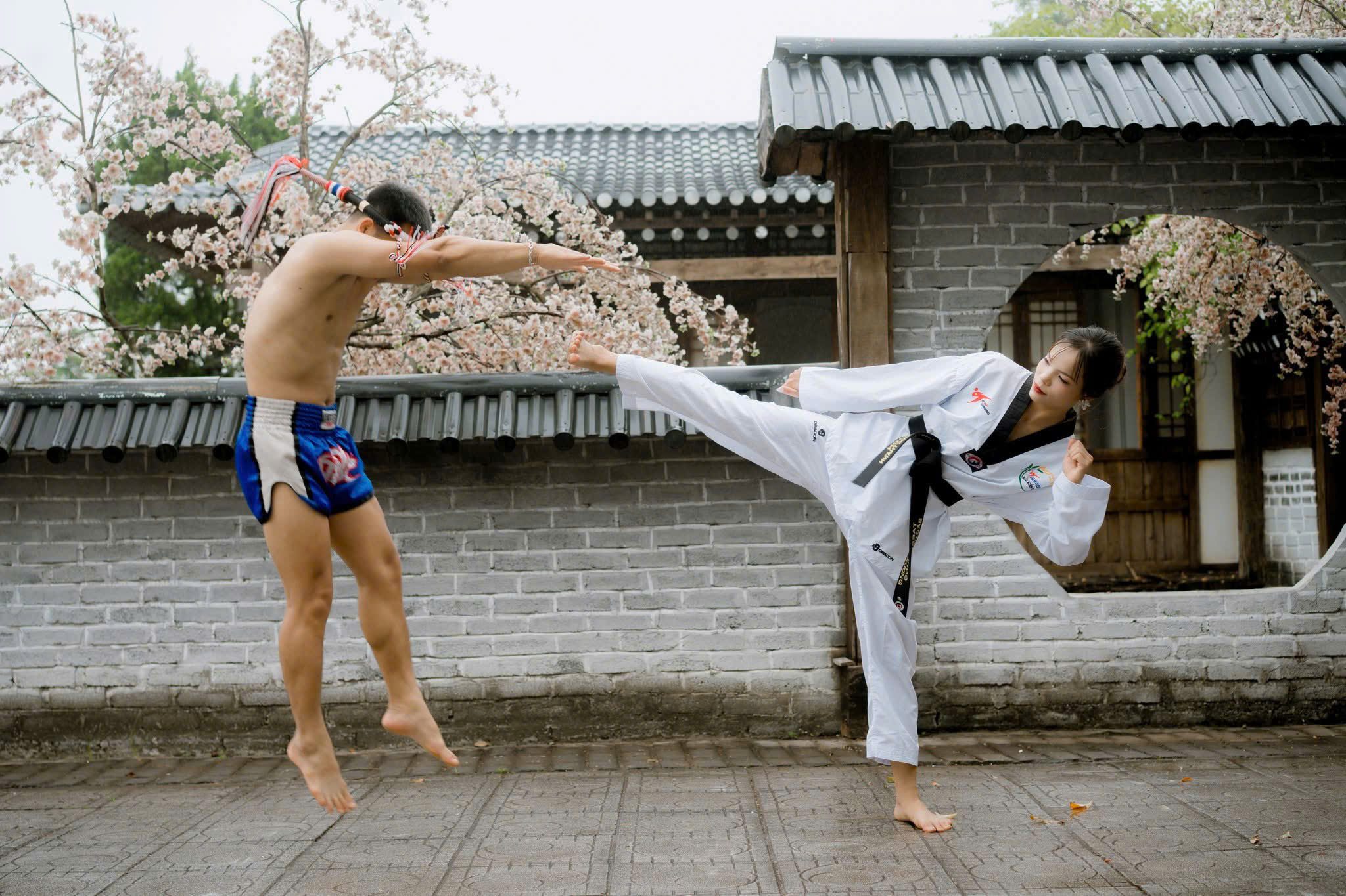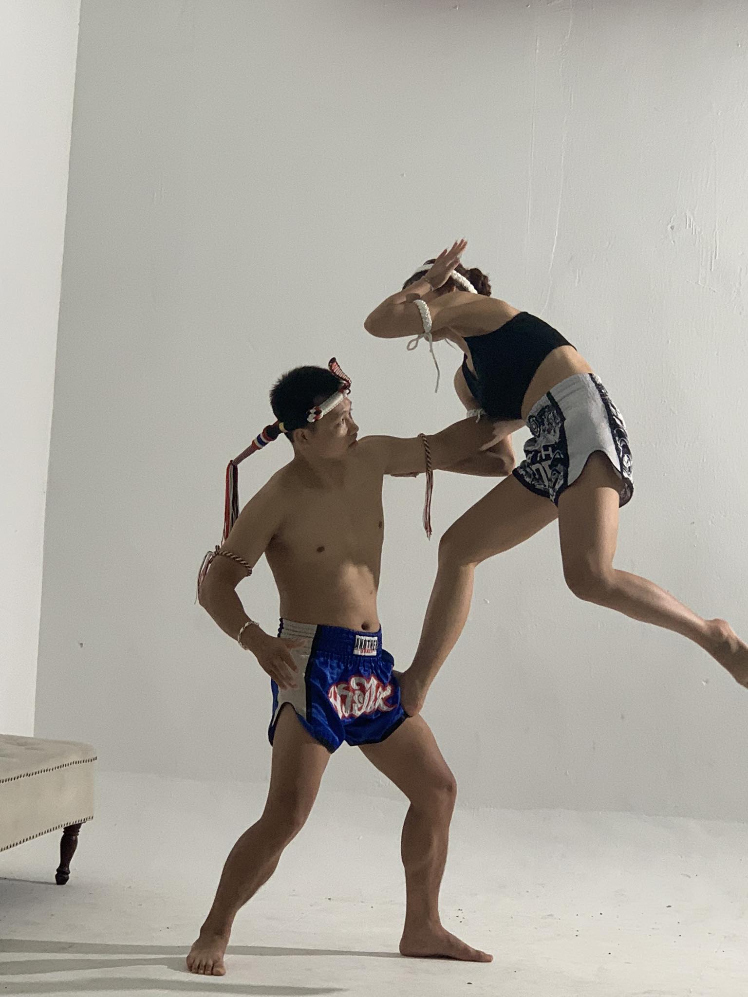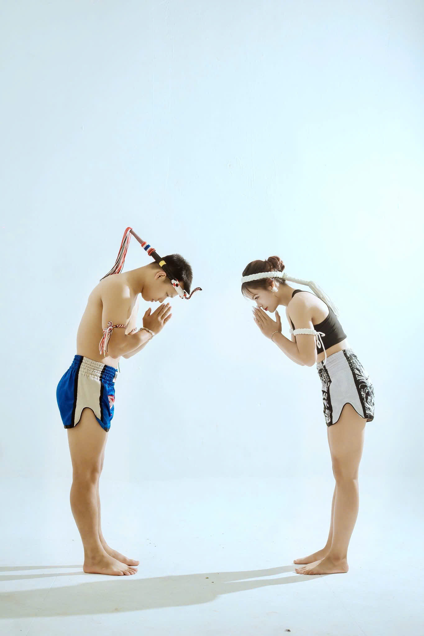 Trà My và Quốc Khánh đã thực hiện một bộ ảnh cưới độc nhất vô nhị, được dàn dựng như một màn đấu võ. Hai võ sĩ làm động tác cúi chào nhau trước khi bắt đầu một trận đấu võ Moay Thai