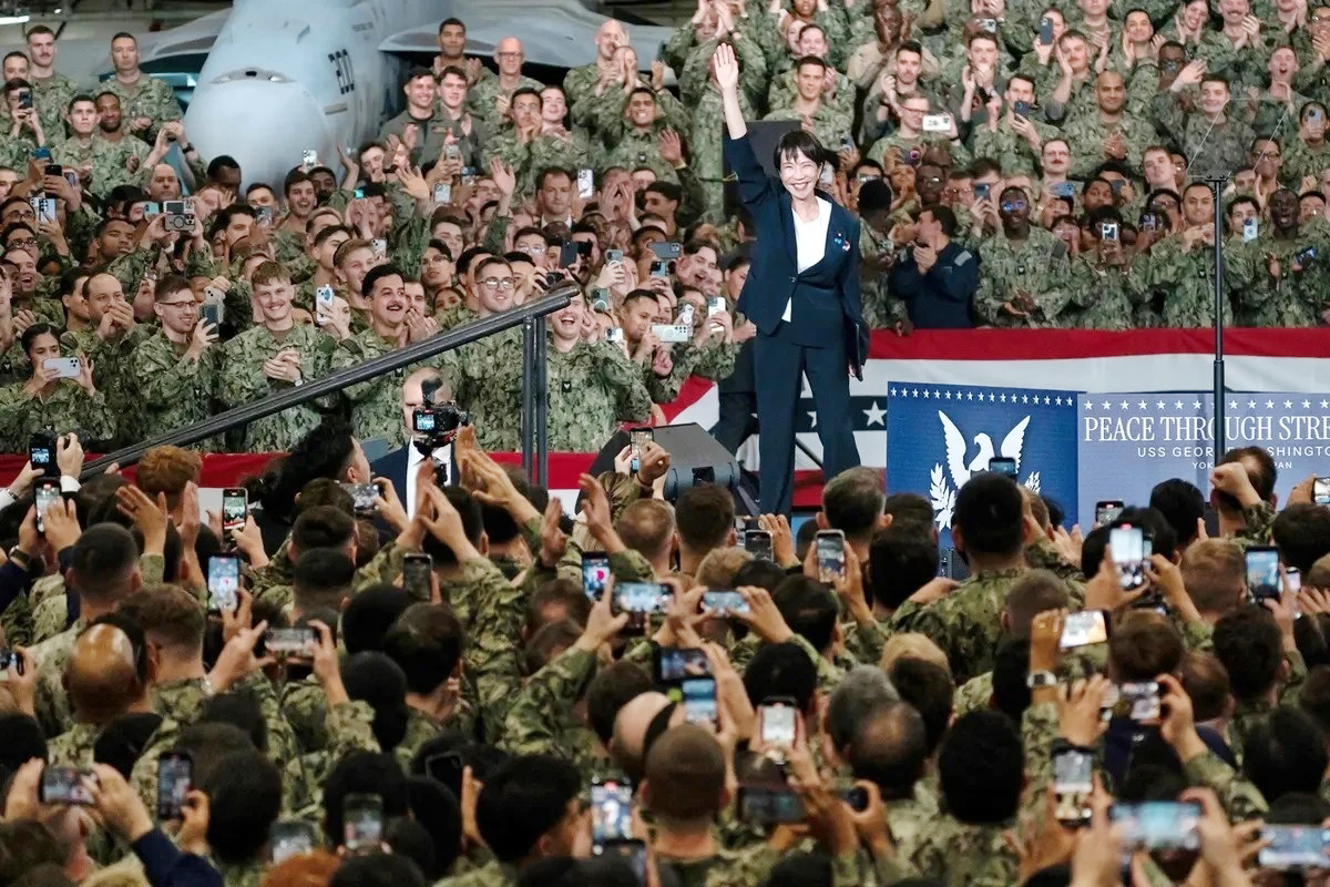 Bà Takaichi trên tàu USS George Washington tại căn cứ hải quân Mỹ ở Yokosuka trong chuyến thăm Nhật Bản của Tổng thống Mỹ Donald Trump ngày 28/10/2025