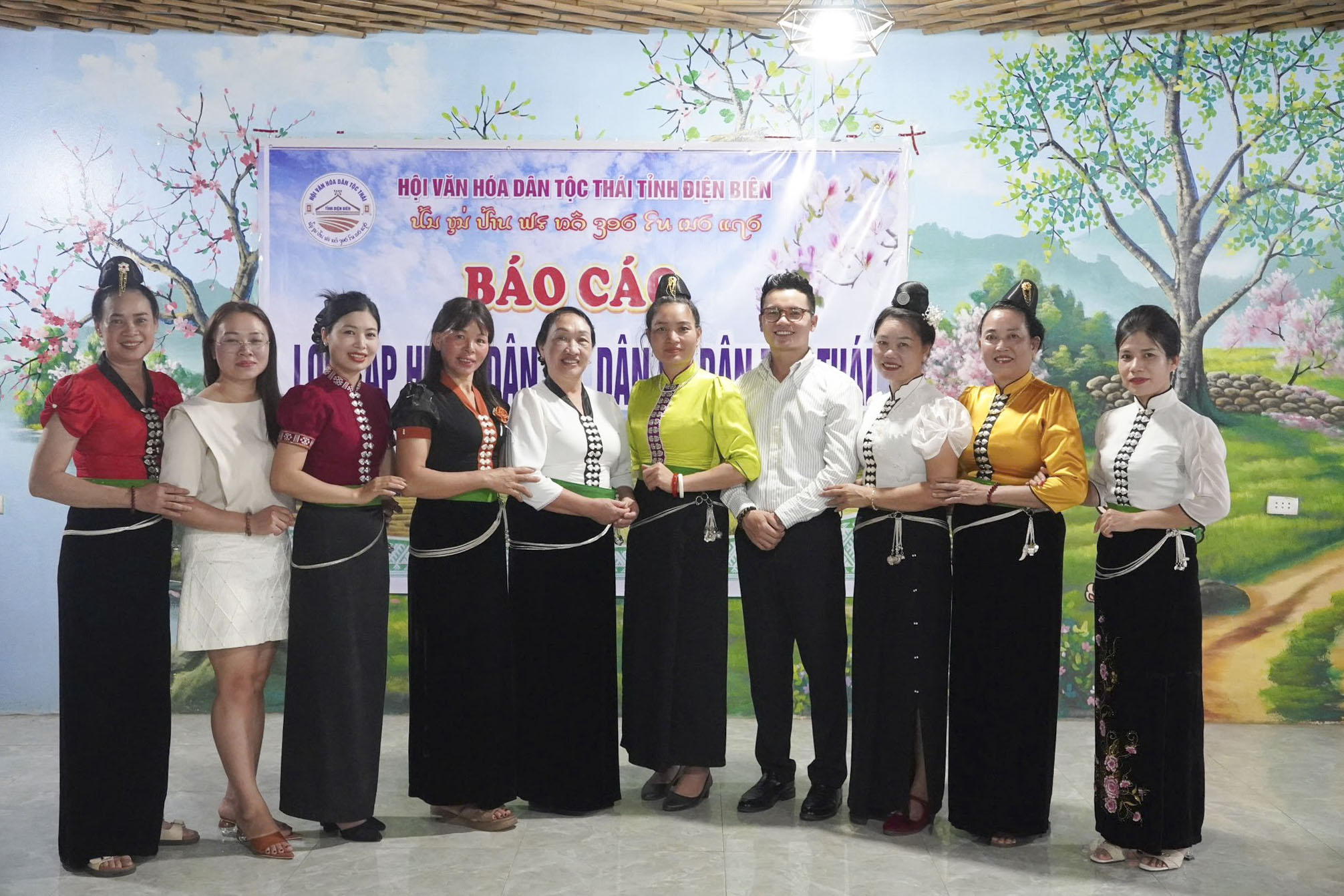 Nghệ nhân Lò Thị Lả (thứ 5, từ trái sang) cùng các thành viên lớp tập huấn dân ca, dân vũ dân tộc Thái do Hội Văn hoá dân tộc Thái tỉnh Điện Biên tổ chức