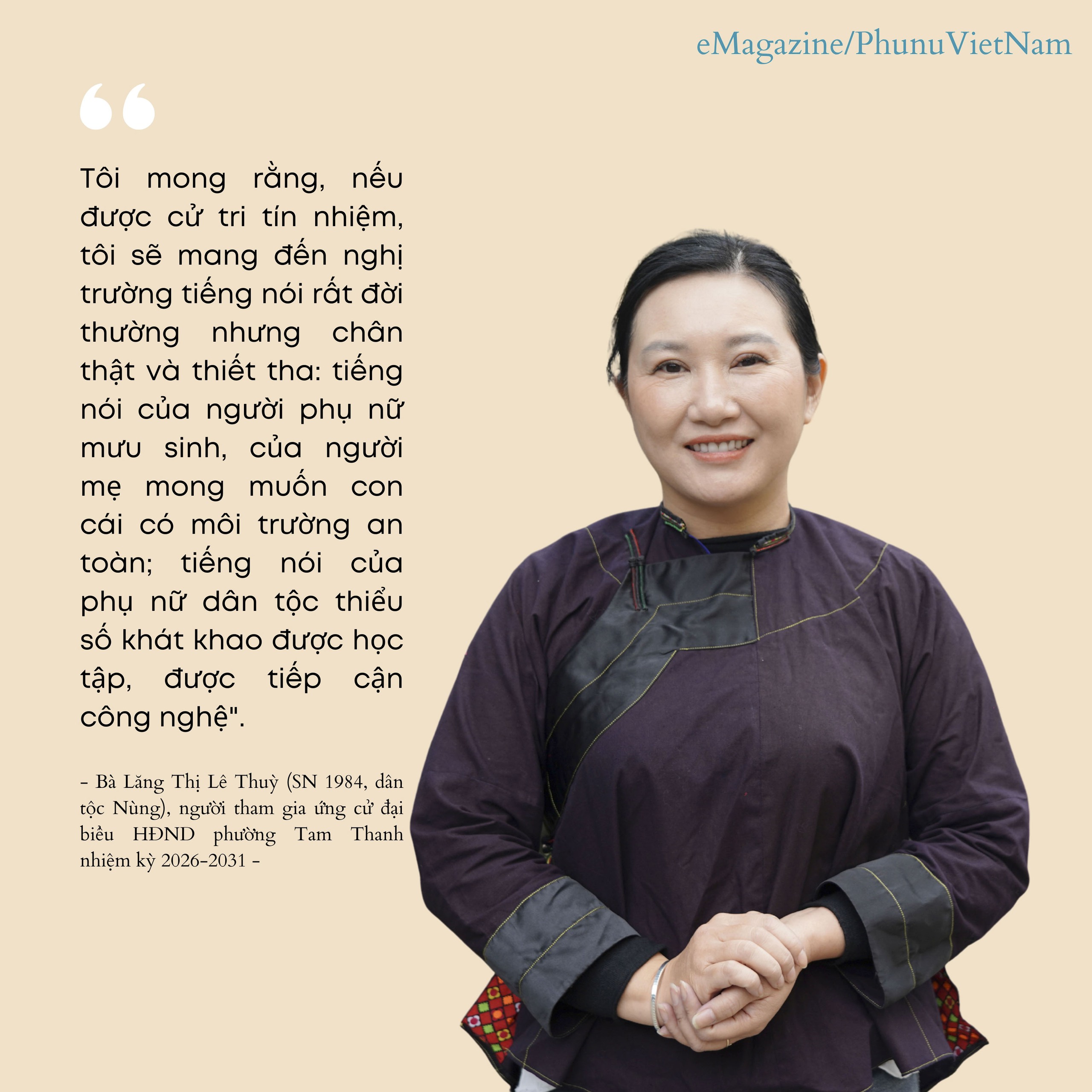 Tiếp nối thế hệ đi trước là những gương mặt mới đầy triển vọng cho nhiệm kỳ 2026-2031, tiêu biểu là bà Lăng Thị Lê Thùy (SN 1984), một phụ nữ dân tộc Nùng. Hiện là Phó Chủ tịch Thường trực Ủy ban MTTQ Việt Nam phường kiêm Chủ tịch Hội LHPN phường, bà Thùy đại diện cho thế hệ cán bộ nữ trẻ, năng động và được đào tạo bài bản. Từng trải qua công tác Đoàn, có kinh nghiệm giảng dạy kỹ năng sống, bà Thùy bước vào cuộc bầu cử với một tâm thế vừa tự tin vừa thận trọng.