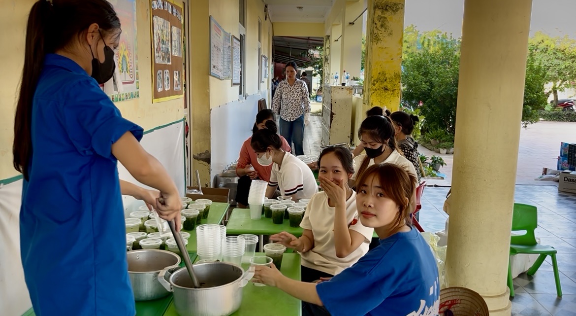 Trong khuôn viên trường, khu bếp ăn được tận dụng làm nơi nấu nướng chung. Cơm canh nóng hổi được các đoàn thể và người dân trong xã chung tay nấu, phát hai bữa mỗi ngày. Mỗi khi có đoàn cứu trợ về, trẻ em lại ríu rít xếp hàng nhận sữa, bánh, áo mưa.