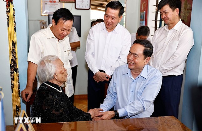Chủ tịch Quốc hội Trần Thanh Mẫn thăm, tặng quà Mẹ Việt Nam Anh hùng Đào Thị Vui. Ảnh: Doãn Tấn/TTXVN