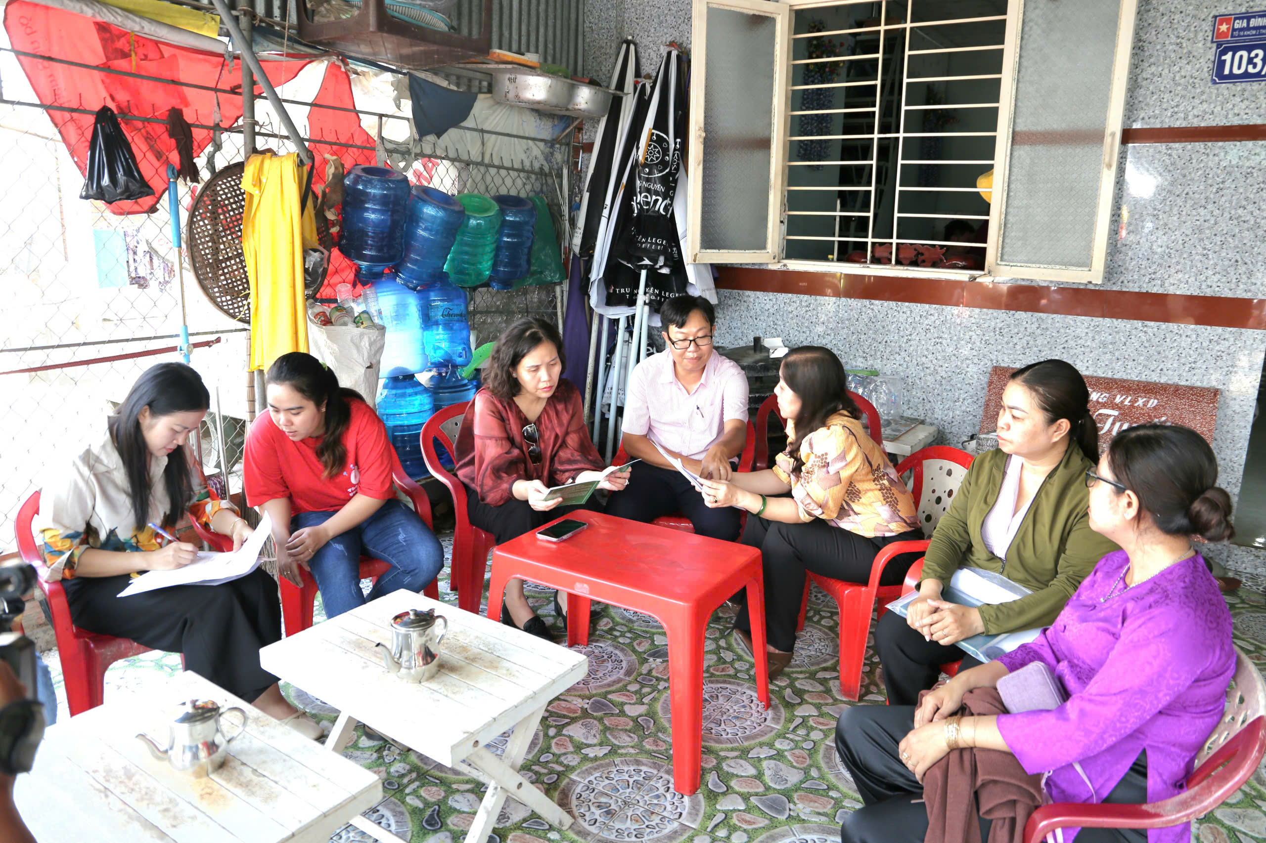 Bà Trần Thị Thu Hà (bìa phải), Phó Trưởng ban Ban Công tác phụ nữ, Trung ương Hội LHPN Việt Nam, khảo sát hiệu quả sử dụng nguồn vốn của hội viên phụ nữ xã Châu Thành, tỉnh Vĩnh Long