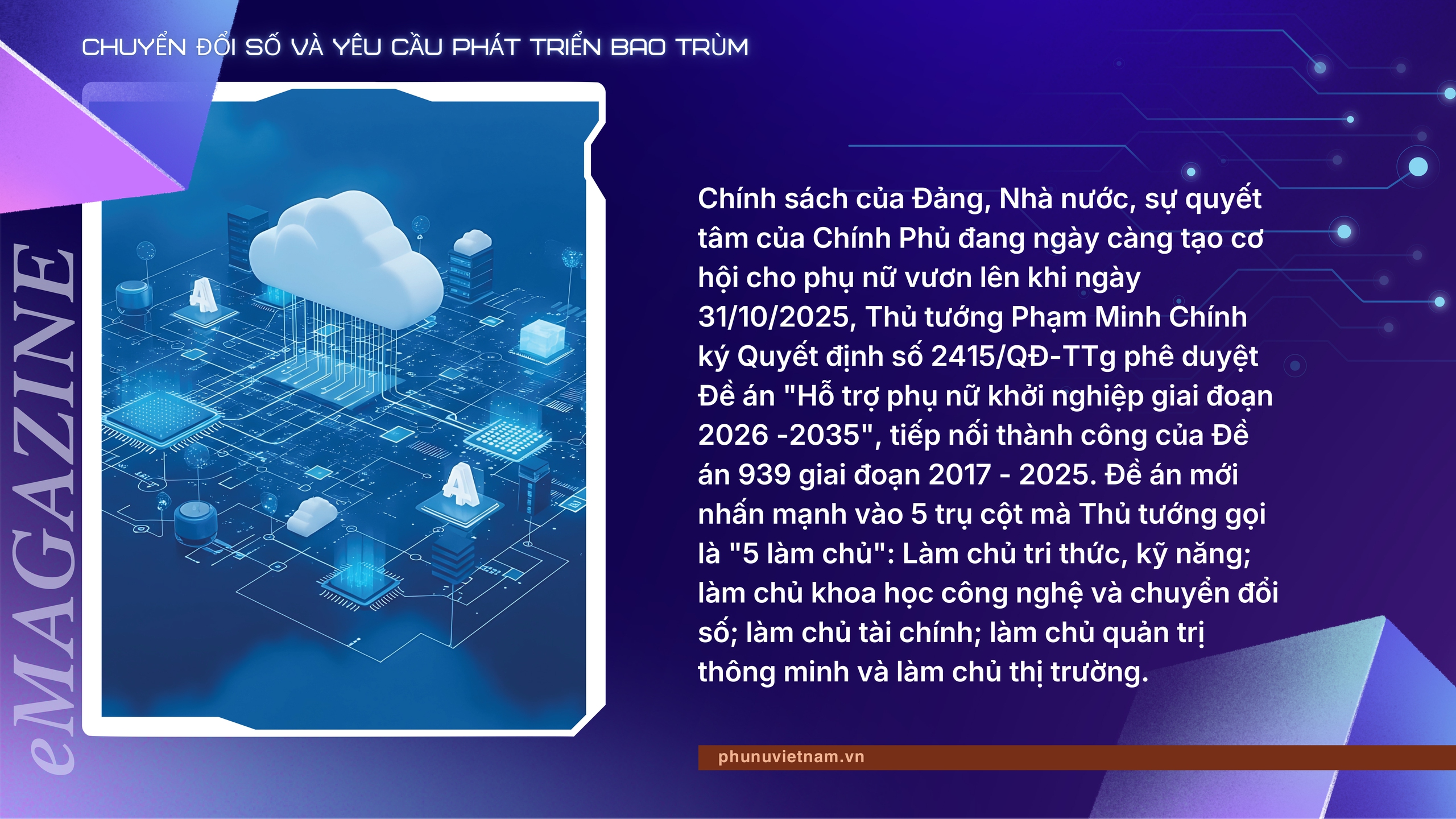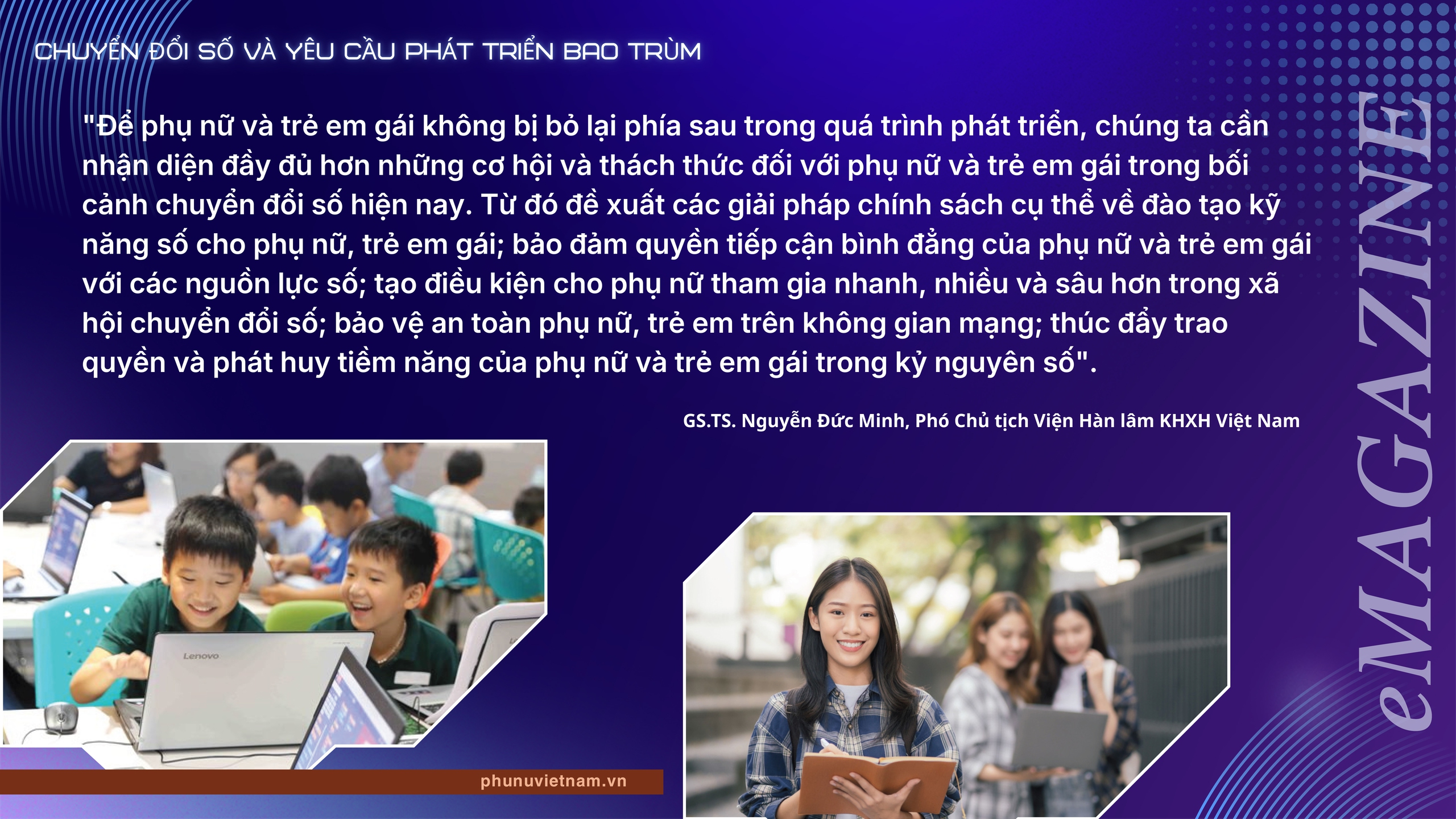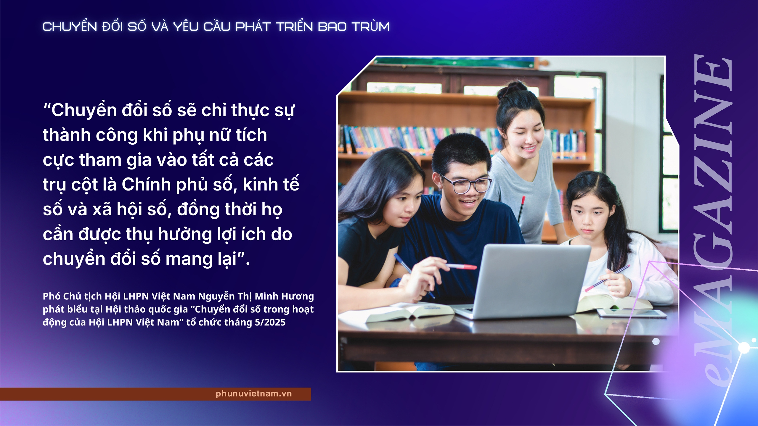 Không chỉ trong lĩnh vực kinh tế mà trên tất cả các lĩnh vực của đời sống xã hội, các tầng lớp phụ nữ Việt Nam ở mọi thành phần, lứa tuổi đã bền bỉ, nỗ lực từng ngày trên "đường đua công nghệ", tham gia và đóng góp tích cực vào công cuộc chuyển đổi số vì sự phát triển bao trùm và bền vững của đất nước. Tuy nhiên, với sự bứt tốc không ngừng nghỉ của Cuộc cách mạng công nghiệp 4.0, những người phụ nữ vẫn còn chịu những thiệt thòi, bất bình đẳng do định kiến giới, đặc biệt là nhóm yếu thế như phụ nữ nông thôn, phụ nữ dân tộc thiểu số, lao động phi chính thức dễ bị đẩy ra ngoài các dòng chảy mới của kinh tế số, mất cơ hội tiếp cận việc làm tốt hơn, thu nhập cao hơn và các dịch vụ thiết yếu. Khoảng cách số vì thế không chỉ là khoảng cách về công nghệ, mà còn kéo theo khoảng cách về thu nhập, tri thức và quyền tham gia xã hội của phụ nữ. Với những lý do đó, chuyển đổi số không chỉ còn là câu chuyện của công nghệ. Đó là câu chuyện của công bằng cơ hội.
