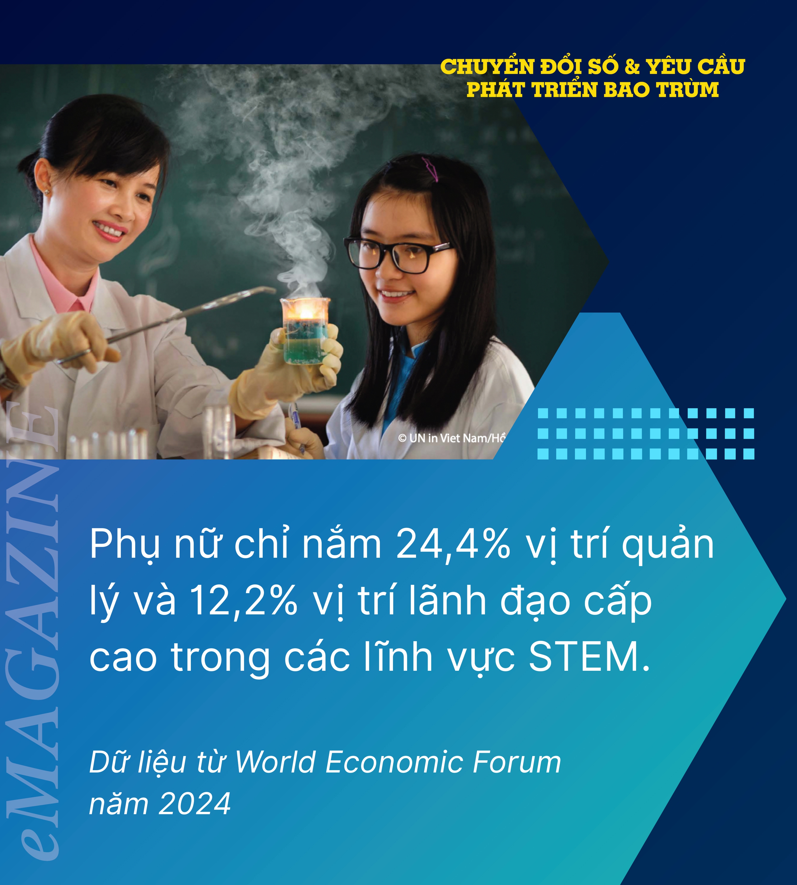 Tại Việt Nam, phụ nữ vẫn chiếm tỷ lệ khiêm tốn trong các ngành này. Báo cáo nghiên cứu "Nâng cao vị thế của phụ nữ trong lãnh đạo và quản lý nhà nước về khoa học, công nghệ, đổi mới sáng tạo và chuyển đổi số trong khu vực công tại Việt Nam" do Trung tâm Ứng dụng Khoa học và Khởi nghiệp và UNDP tại Việt Nam phối hợp thực hiện năm 2025 cho thấy, tỷ lệ nữ tốt nghiệp đại học chuyên ngành STEM khoảng 36,5%. Tiếp đó, nghiên cứu thực hiện năm 2025 của Hội Nữ trí thức VN phối hợp với UNDP cũng chỉ ra, chỉ 26,6% chủ nhiệm đề tài khoa học trong lĩnh vực khoa học kỹ thuật là nữ.