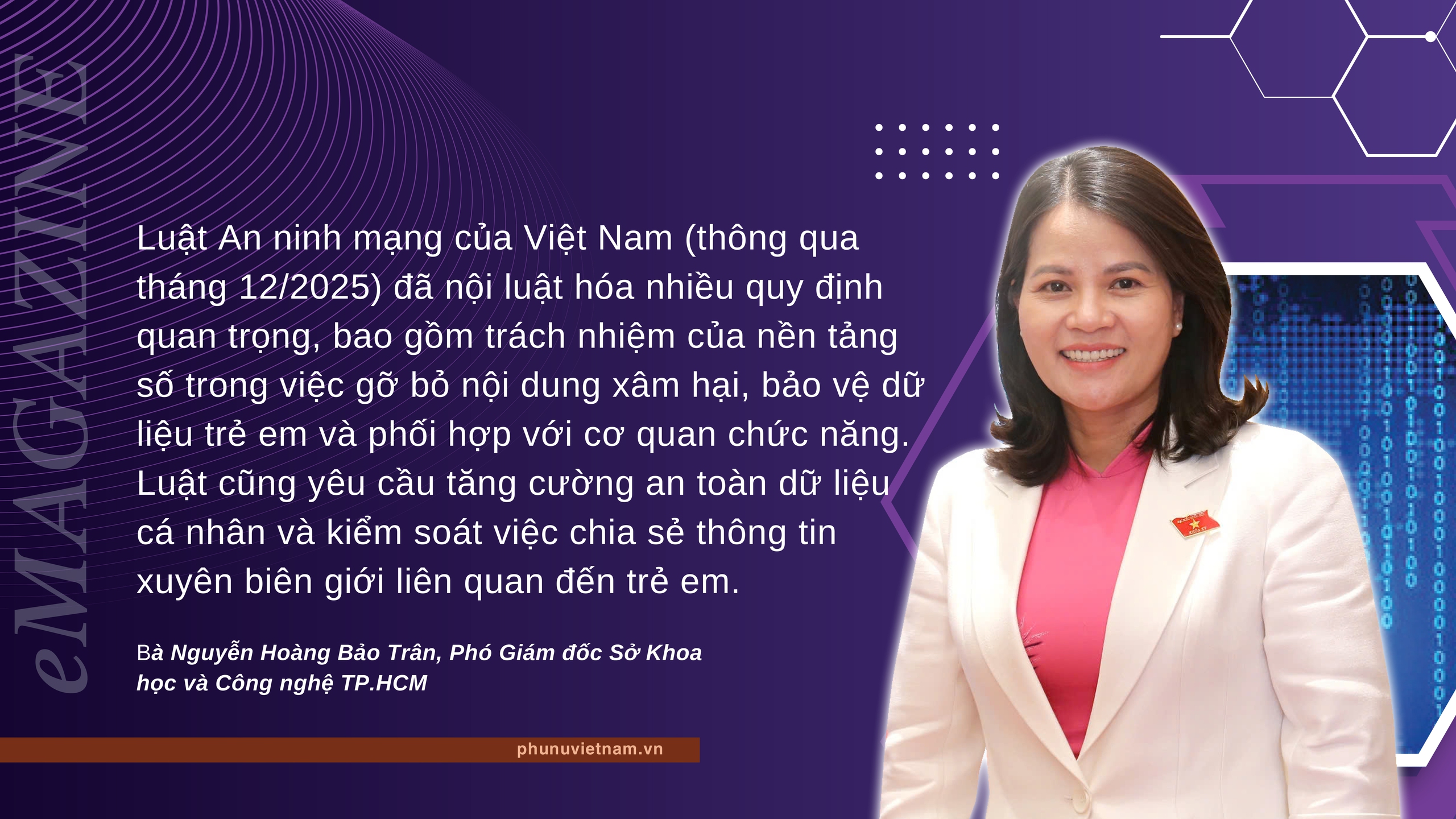 Bên cạnh đó, bà Nguyễn Hoàng Bảo Trân, Phó Giám đốc Sở Khoa học và Công nghệ TPHCM, cho biết, Luật An ninh mạng của Việt Nam (thông qua tháng 12/2025) đã nội luật hóa nhiều quy định quan trọng, bao gồm trách nhiệm của nền tảng số trong việc gỡ bỏ nội dung xâm hại, bảo vệ dữ liệu trẻ em và phối hợp với cơ quan chức năng. Luật cũng yêu cầu tăng cường an toàn dữ liệu cá nhân và kiểm soát việc chia sẻ thông tin xuyên biên giới liên quan đến trẻ em.