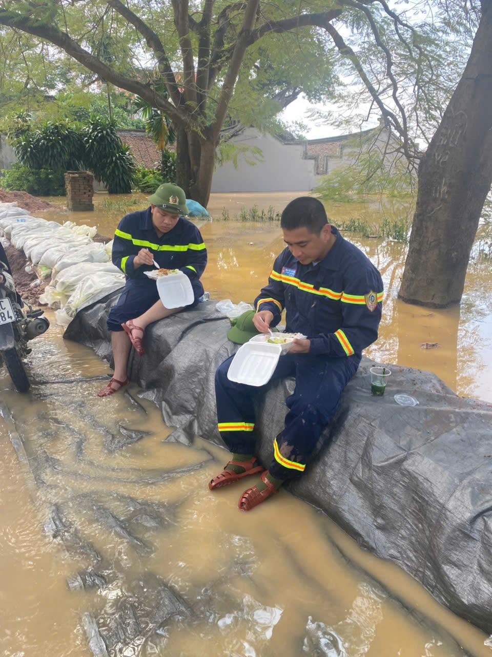 Bữa cơm vội trên chốt đê thôn Châu Lỗ, xã Xuân Cẩm, Bắc Ninh giữa trưa ngày 9/10 của lực lượng cứu hộ.