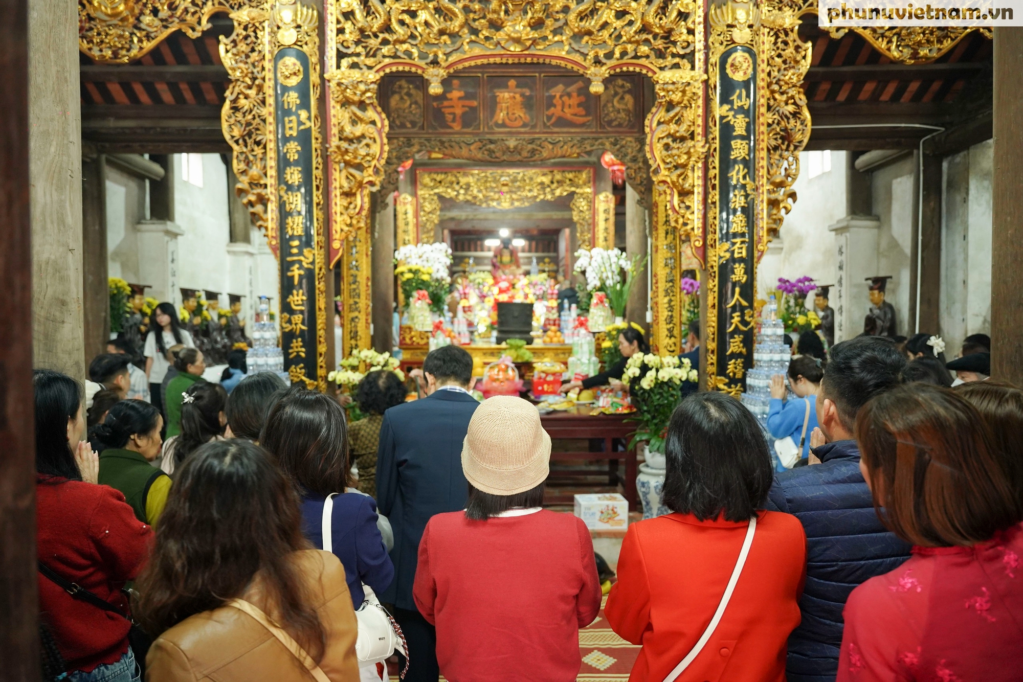 Tại khu vực chính điện, dòng người chen chúc di chuyển khó khăn để vào chiêm bái pho tượng Phật Pháp Vân. Bức tượng sơn màu mận chín tạc bằng gỗ thời Lê Trung Hưng này biểu trưng cho thần Mây, cầu mong mưa thuận gió hòa và đã được công nhận Bảo vật Quốc gia.