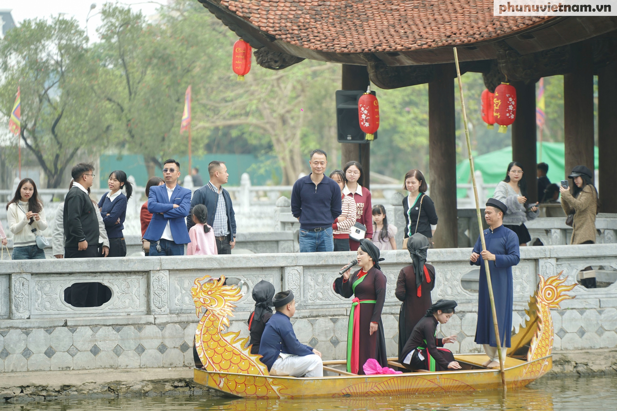 Cảnh sắc ngày Xuân thêm phần mượt mà, đậm đà bản sắc khi các liền anh, liền chị cất cao câu hát quan họ tại khu vực thủy đình. Lời ca duyên dáng vang vọng trên mặt nước làm say lòng du khách thập phương khi về thăm quê hương quan họ.