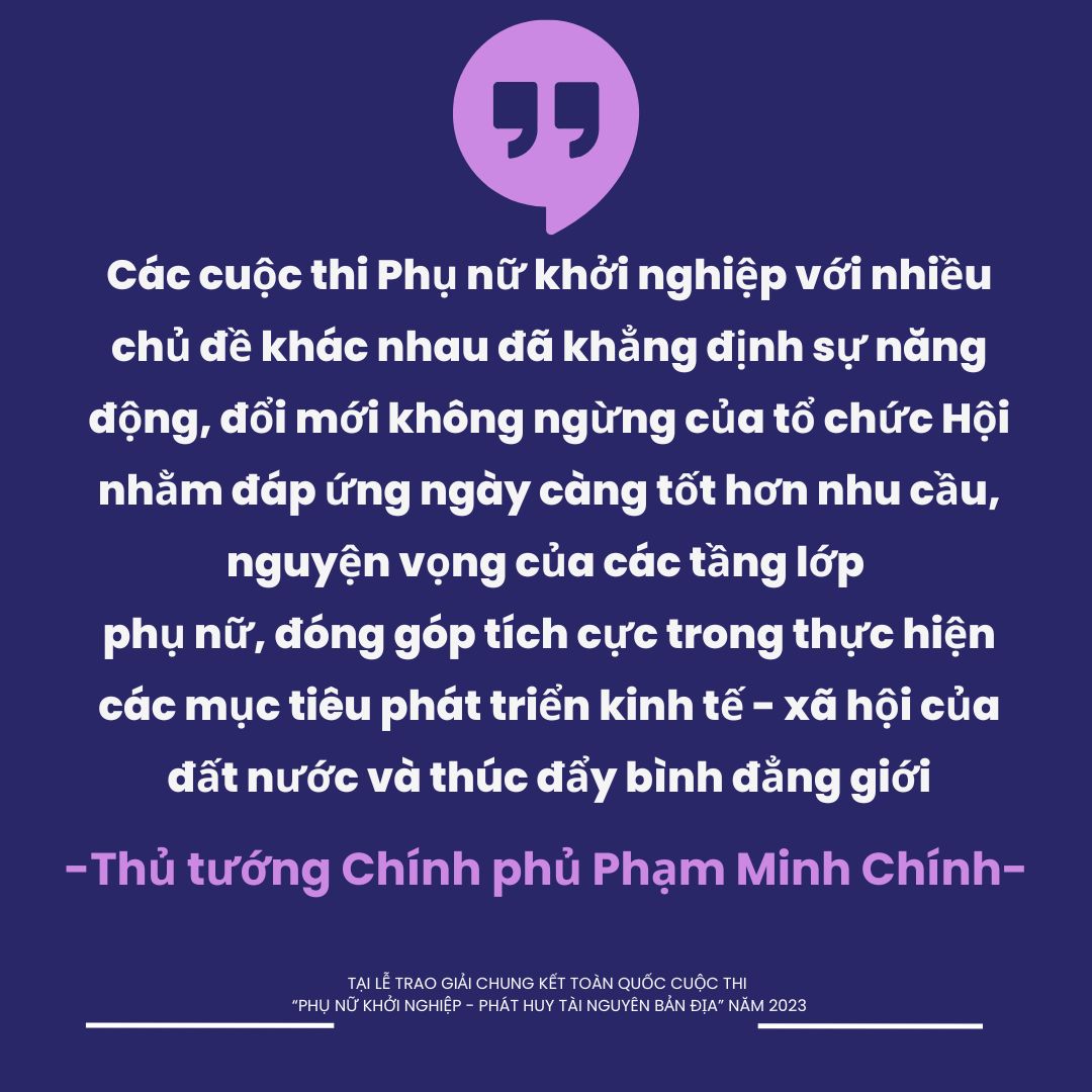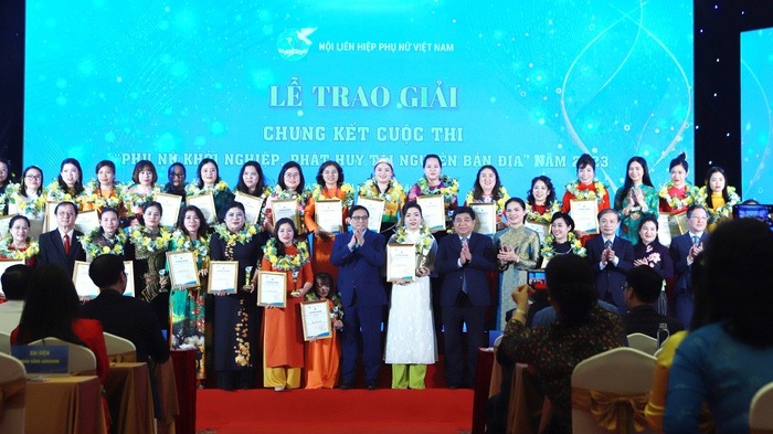 Thủ tướng Chính phủ Phạm Minh Chính và lãnh đạo các Bộ, ngành, Hội LHPN Việt Nam cùng tác giả dự án được vinh danh tại Lễ trao giải thưởng Chung kết Toàn quốc Cuộc thi “Phụ nữ khởi nghiệp, phát huy tài nguyên bản địa” năm 2023