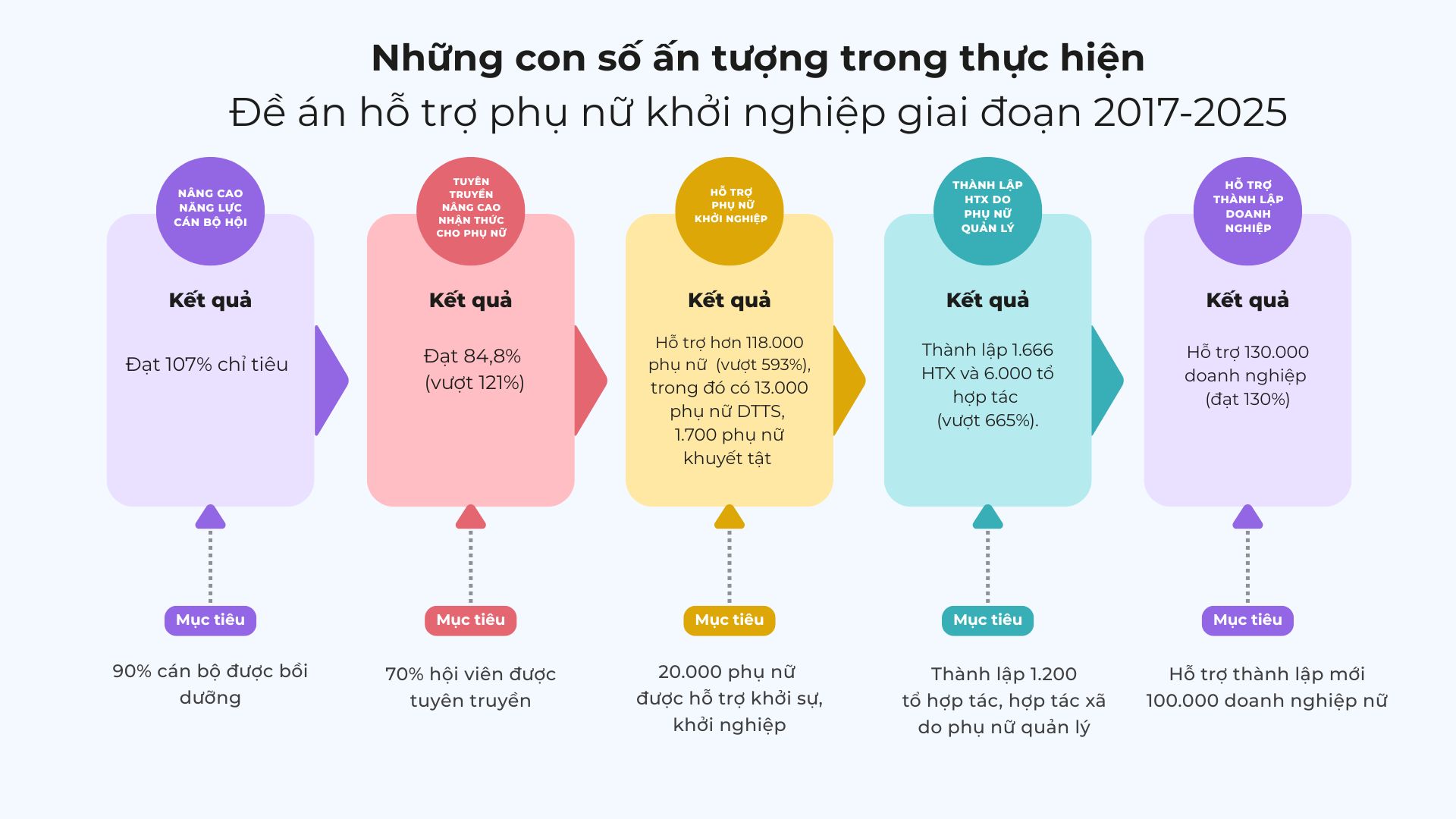 Mục tiêu ban đầu của Đề án là hỗ trợ 20.000 phụ nữ khởi nghiệp, song, kết thúc giai đoạn 2017-2025, con số thực tế đã lên tới 118.533, gấp gần sáu lần dự kiến. Trong đó, có 20.000 phụ nữ nghèo, 13.000 phụ nữ dân tộc thiểu số và 1.700 phụ nữ khuyết tật là những nhóm vốn ít cơ hội tiếp cận các chương trình hỗ trợ chính thức.