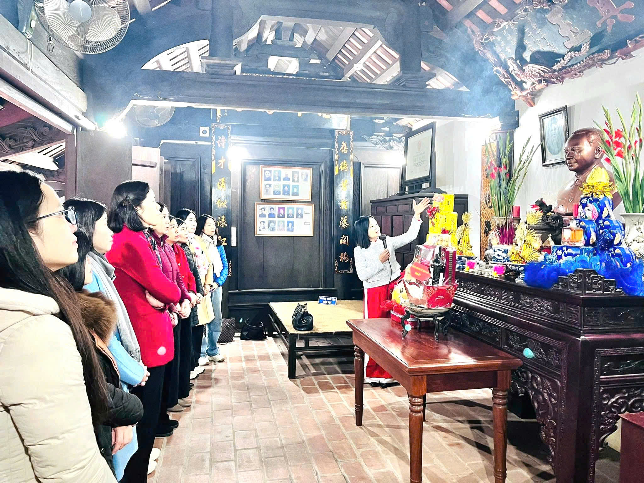 Phó Chủ tịch Hội LHPN Việt Nam Nguyễn Thị Minh Hương (thứ 5 từ trái sang) và các đại biểu tại Nhà lưu niệm Tổng Bí thư Trường Chinh (làng Hành Thiện, xã Xuân Hồng, tỉnh Ninh Bình)