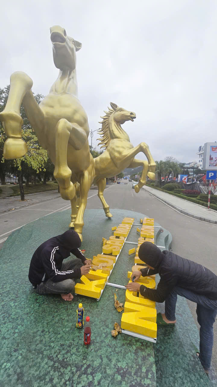 Cặp ngựa vàng được dựng ở khu vực đường hoa xuân xứ Lạng