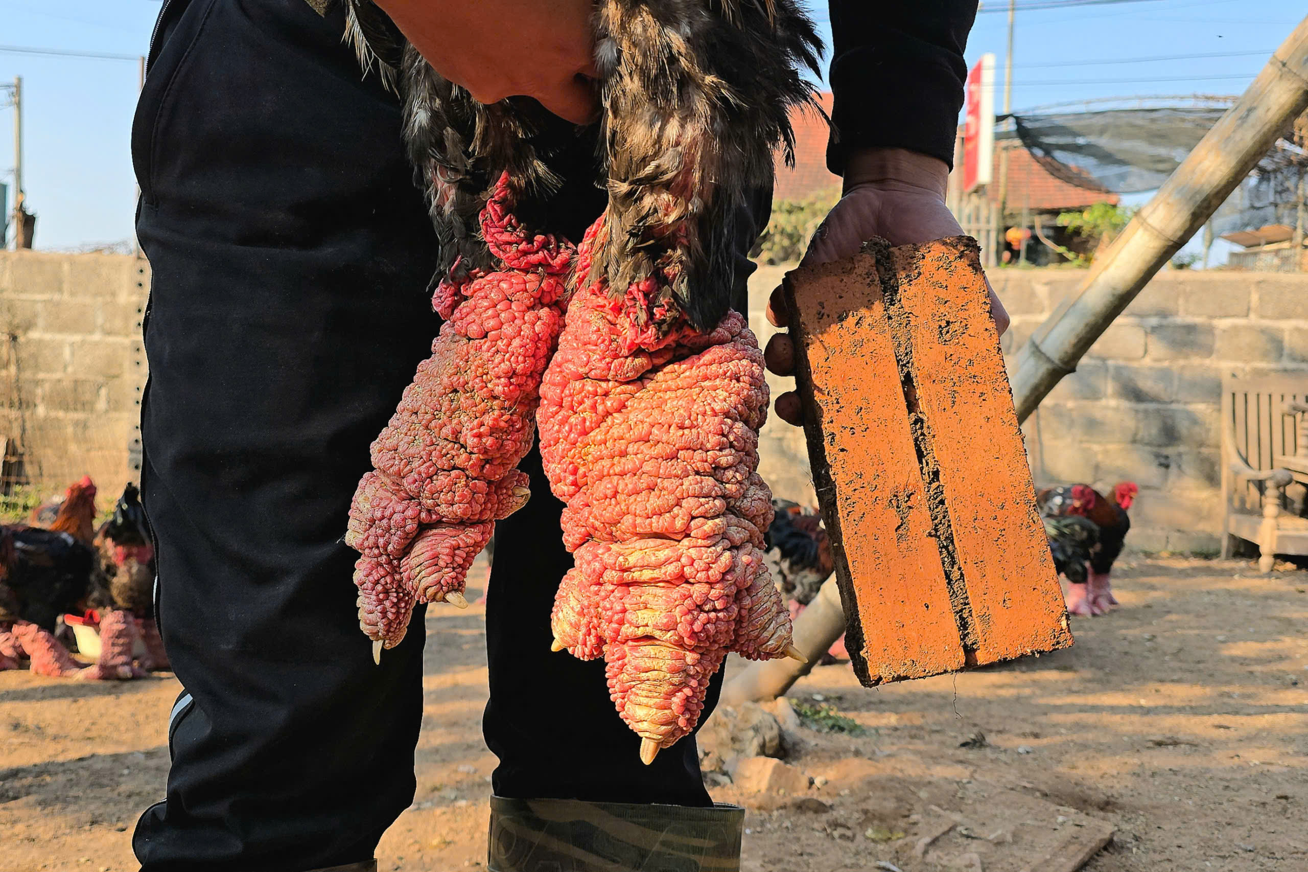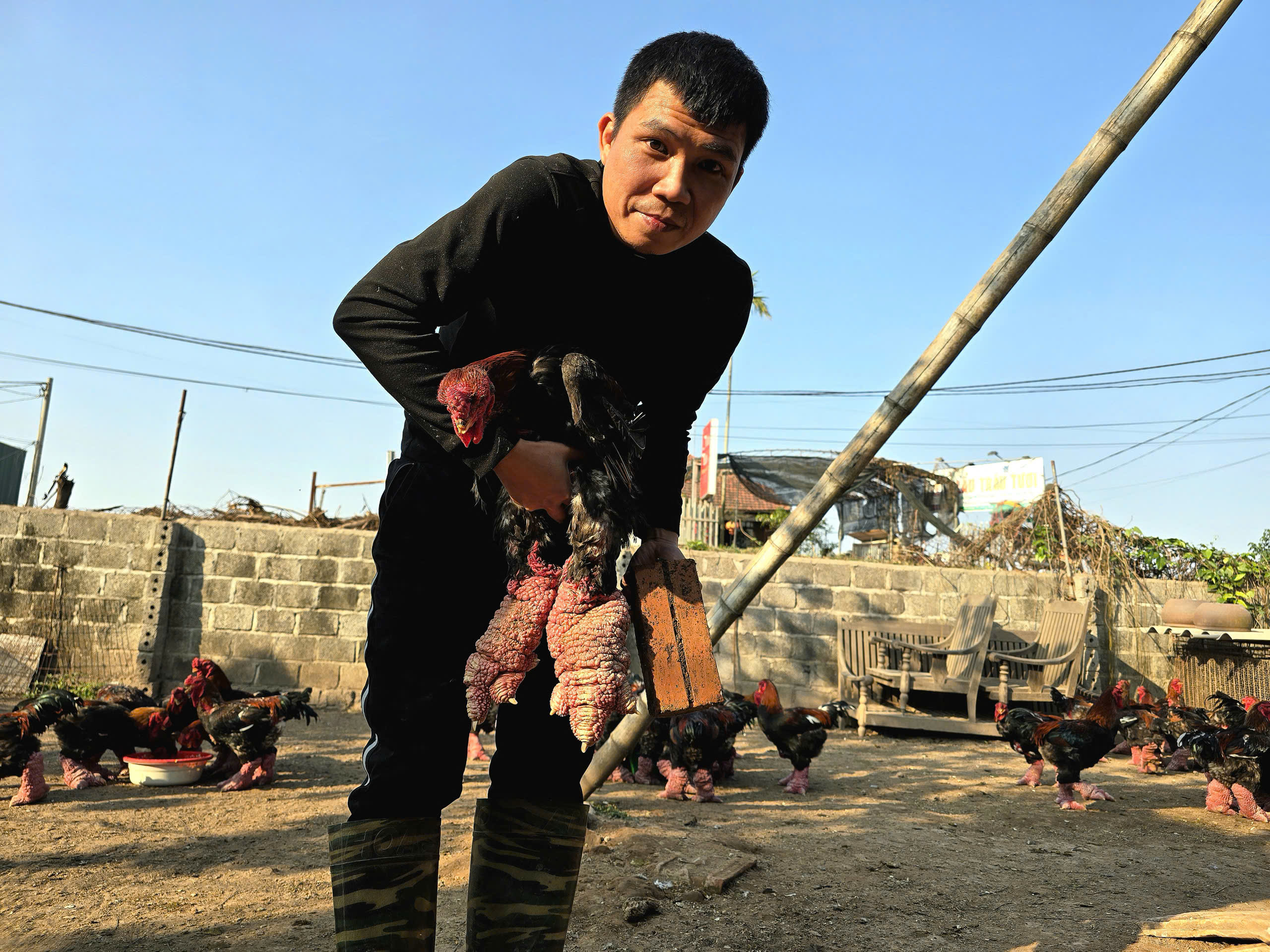 Anh Luân giới thiệu một con gà trống nặng khoảng 6kg, có hình dáng khá đẹp. Cặp chân nó đỏ au, to, dài, các vảy thịt nổi rõ, sờ chắc tay. Khi đặt cạnh viên gạch xây nhà loại hai lỗ (bề ngang 8cm), phần chân gà lớn hơn rõ rệt. Con gà này được bán với giá 3 triệu đồng.