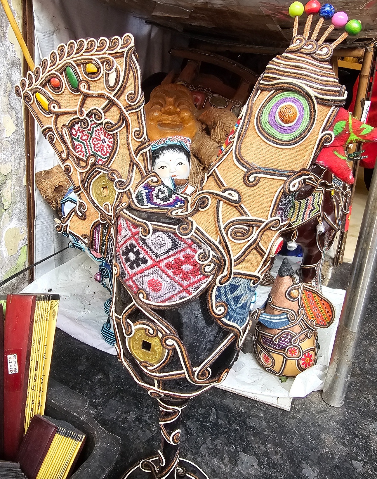 Điểm đặc biệt trong các sản phẩm của chị Thanh nằm ở cách kết hợp giữa hình khối giản dị và các chi tiết trang trí mang màu sắc dân gian. Một chiếc hộp giấy, một chiếc khay cũ hay một chai thủy tinh… qua bàn tay khéo léo có thể trở thành hình con ngựa, con gà hay con cá.
