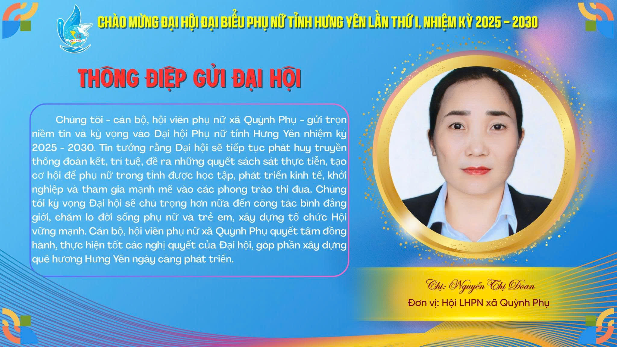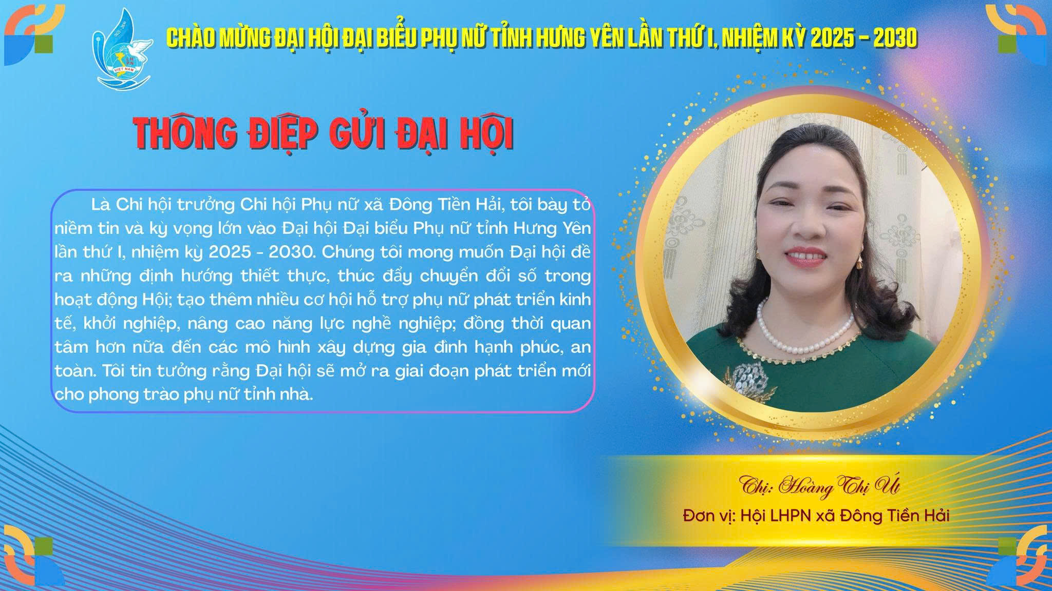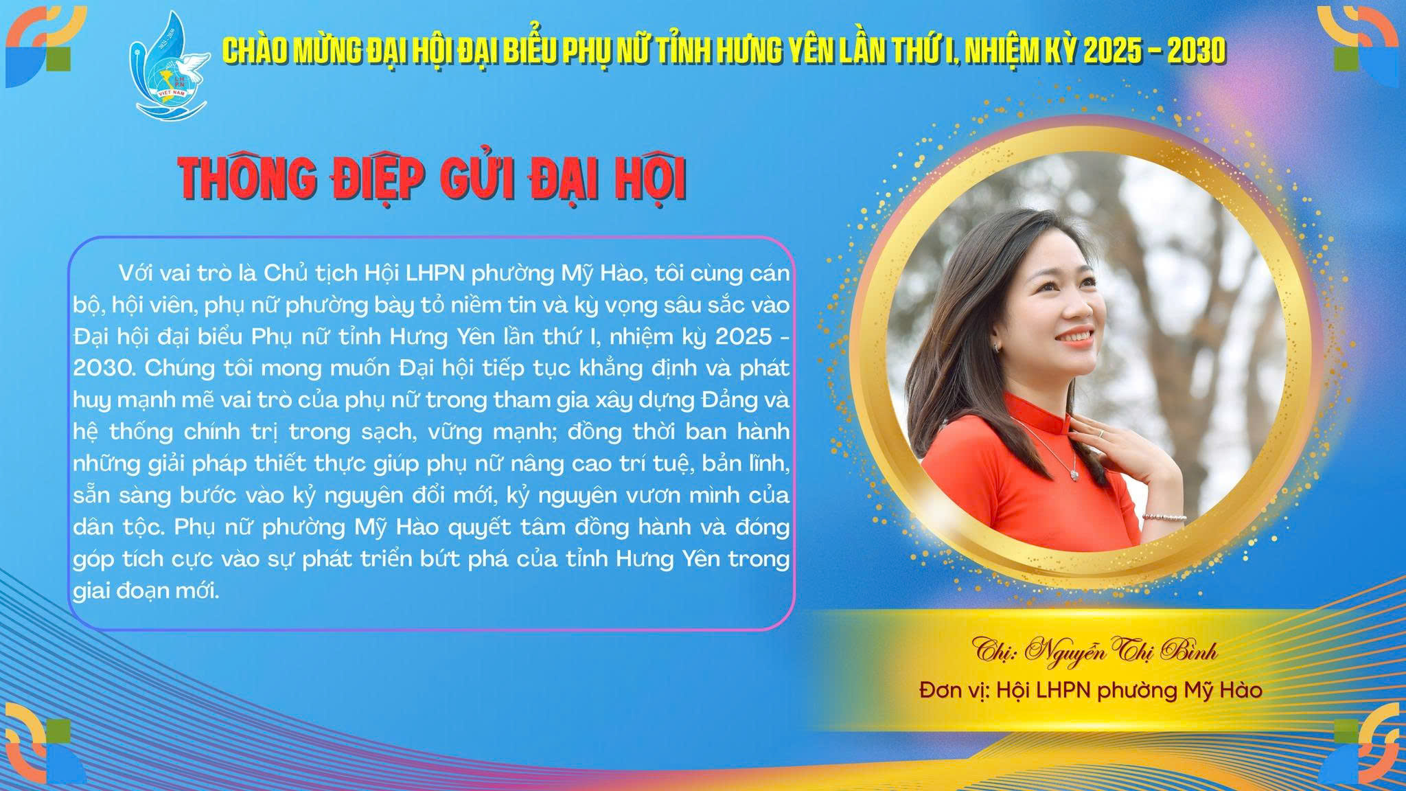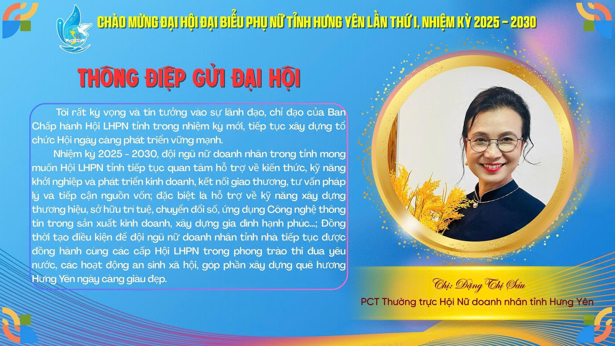 Đại hội đại biểu Phụ nữ tỉnh Hưng Yên lần thứ I, nhiệm kỳ 2025-2030, có chủ đề: "Phụ nữ Hưng Yên phát huy truyền thống, bản lĩnh, trí tuệ, khát vọng vươn lên trong kỷ nguyên mới, xây dựng tổ chức Hội vững mạnh, góp phần thúc đẩy bình đẳng giới và xây dựng khối Đại đoàn kết toàn dân tộc, chung sức xây dựng tỉnh Hưng Yên hiện đại, giàu đẹp, phồn vinh, văn minh, hạnh phúc".