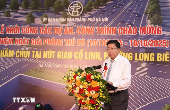 Dự án đầu tư xây dựng hầm chui tại nút giao Cổ Linh, phường Long Biên chính thức khởi công chào mừng kỷ niệm 71 năm Ngày Giải phóng Thủ đô (10/10/1954 - 10/10/2025). Ảnh: Quốc Khánh/TTXVN