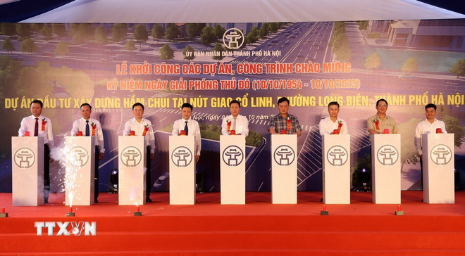Các đại biểu thực hiện nghi thức ấn nút khởi công Dự án đầu tư xây dựng hầm chui tại nút giao Cổ Linh, phường Long Biên - công trình chào mừng kỷ niệm 71 năm Ngày Giải phóng Thủ đô (10/10/1954 - 10/10/2025). (Ảnh: Quốc Khánh/TTXVN)
