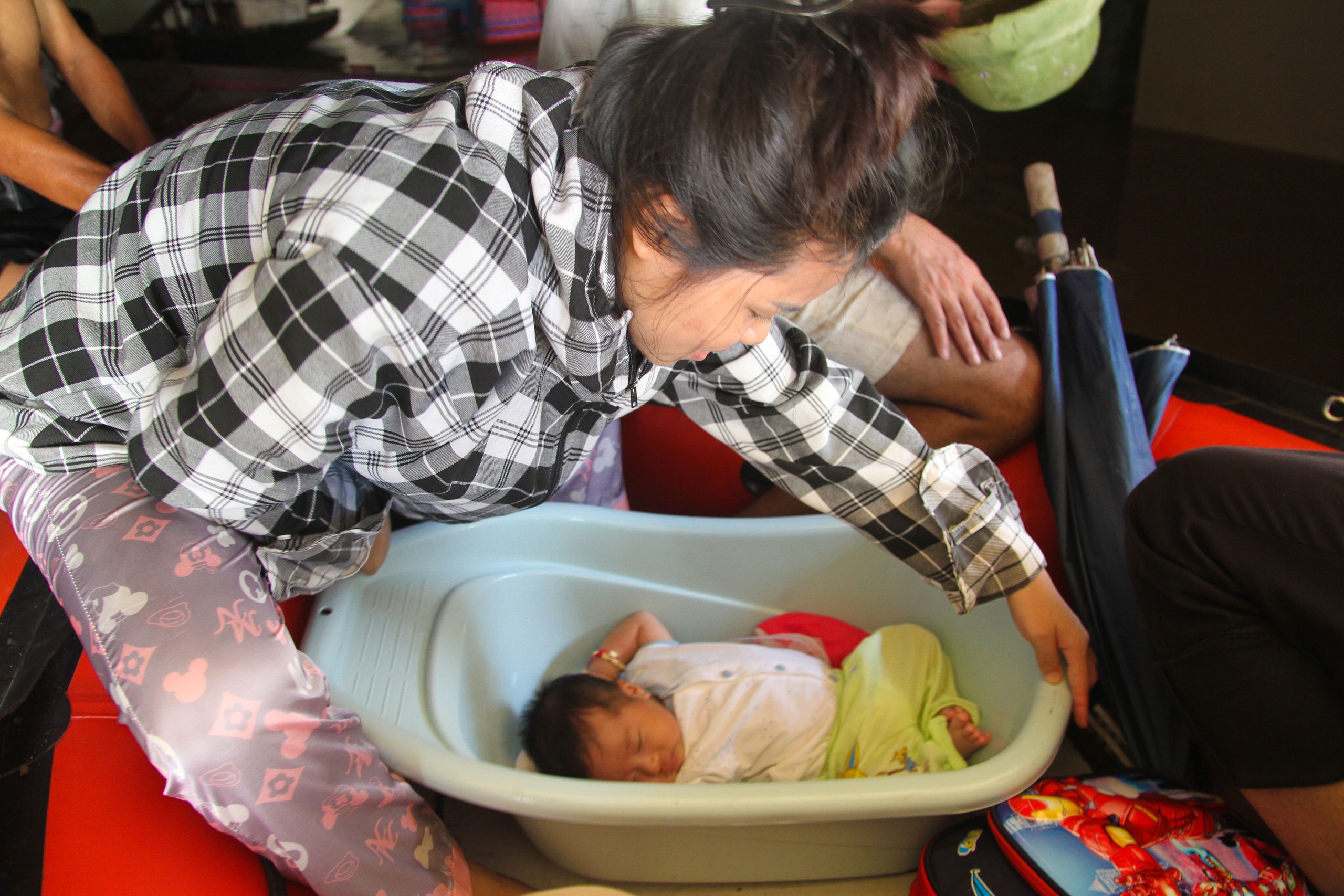 Tại đó, có chị Nguyễn Thị Trang (28 tuổi) đang mang thai 7 tháng và chị Lò Thị Duyên (23 tuổi) cùng người con nhỏ mới 3 tháng tuổi. Bé gái được người thân đặt cẩn thận bên trong 1 chiếc chậu nhỏ, đôi mắt nhắm nghiền tận hưởng giấc ngủ êm đềm.