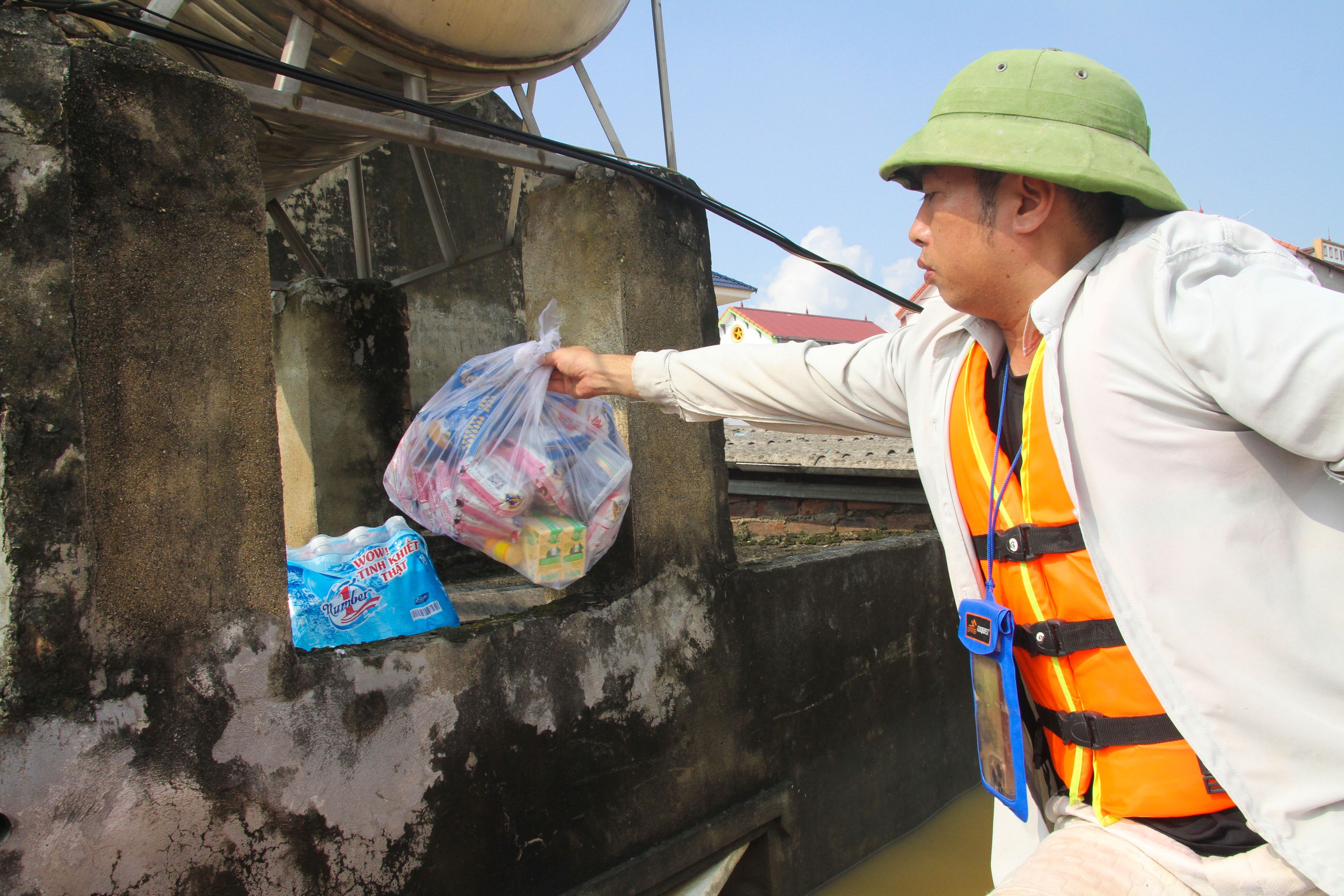 "Bà con ra lấy đồ cứu trợ!" - anh Linh hô lớn rồi dùng một tay cố định xuồng, tay còn lại nhanh chóng chuyển những túi đồ ăn, những thùng nước lọc cẩn thận đặt lên bờ tường hoặc mái nhà. Quá trình giao đồ diễn ra nhanh chóng, dứt khoát. Chẳng có thời gian cho những lời hỏi thăm dài dòng bởi mọi người đều biết phía trước vẫn còn nhiều hộ dân đang chờ.