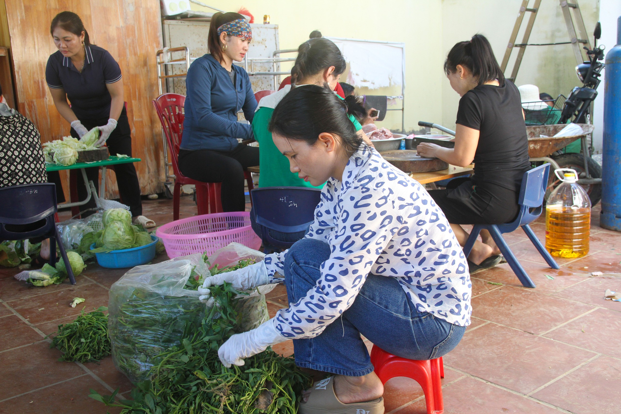Giữa không khí khẩn trương của công tác chống lũ, khu vực bếp ăn của Trường Mầm non xã Hợp Thịnh lại là một không gian rộn ràng và ấm áp đến lạ thường. Đều đặn 2 lần mỗi ngày, hàng chục chị em phụ nữ và giáo viên cùng nhau tụ tập tại đây. Dù làm việc liên tục, trên khuôn mặt mỗi người đều ánh lên niềm vui được sẻ chia. Không khí làm việc diễn ra nhanh nhẹn nhưng rất nhịp nhàng.