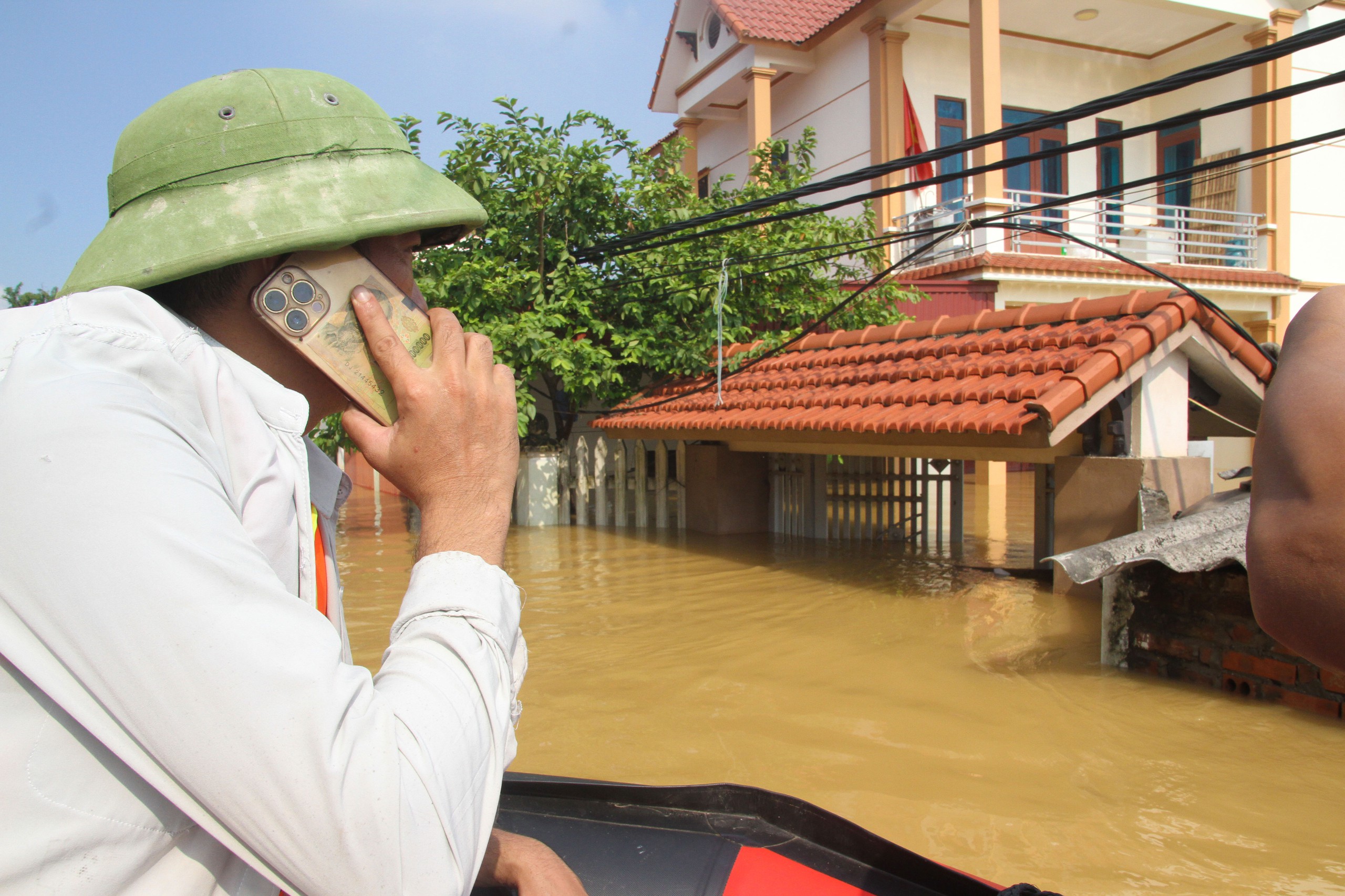 "Hoa tiêu" Ngô Văn Linh vừa chuyển đồ ăn cho người dân mắc kẹt vừa gọi điện cho người dân để nắm tình hình ngập lụt tại vị trí cần đến