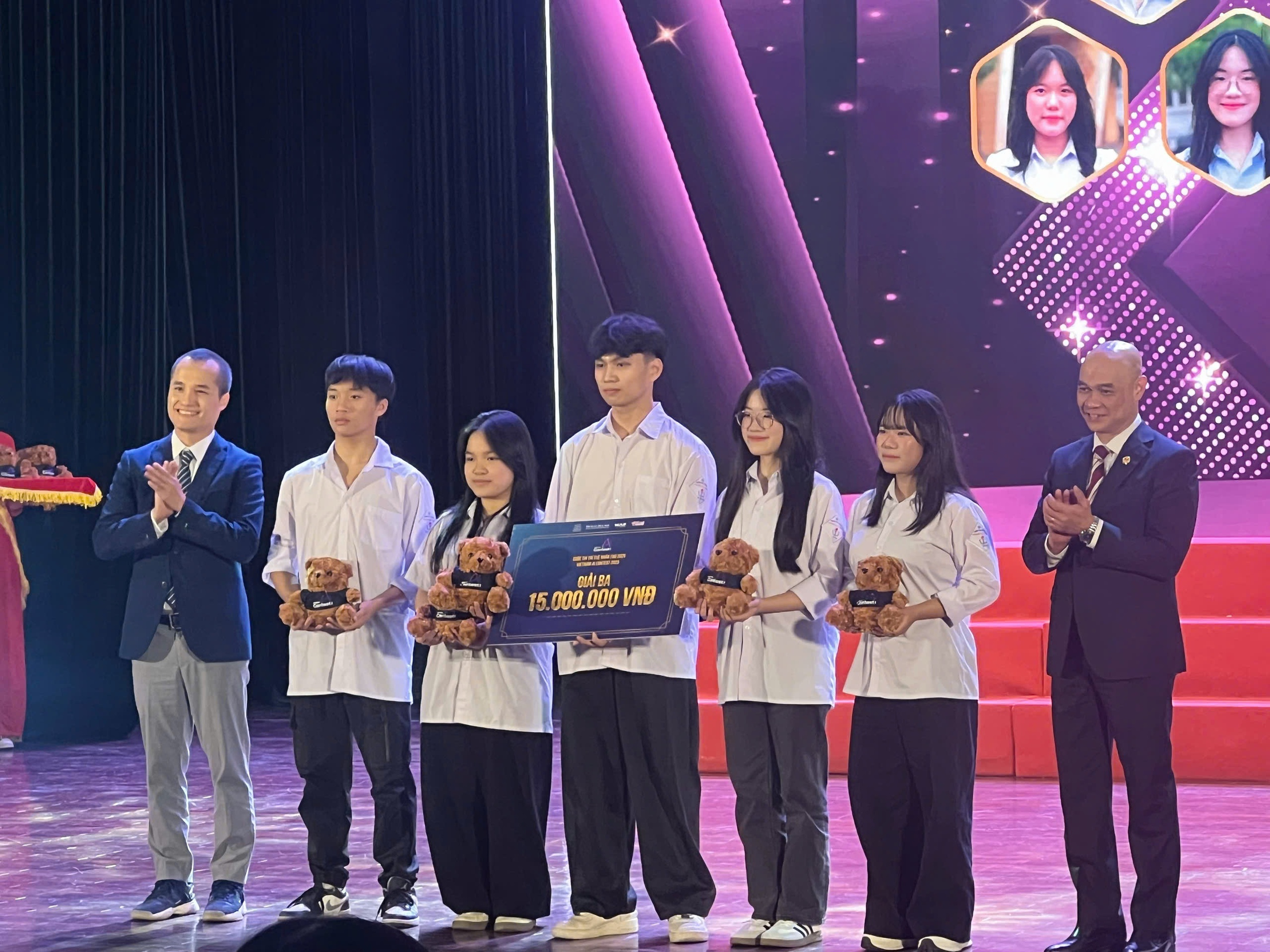 Tại lễ vinh danh, Ban tổ chức đã trao giải nhất cho nhóm học sinh Trường THPT Chuyên Hà Nội - Amsterdam, gồm các em Nguyễn Phụ Phan, Nguyễn Ngọc Huy Anh, Nguyễn Ngọc Khánh Anh, Lê Ngọc Yến Nhi, Nguyễn Tùng Lâm với dự án "Gia sư Robotics": Chatbot chuyên ngành cho VEX/FTC - bước tiến từ AI đại trà sang AI tri thức.
