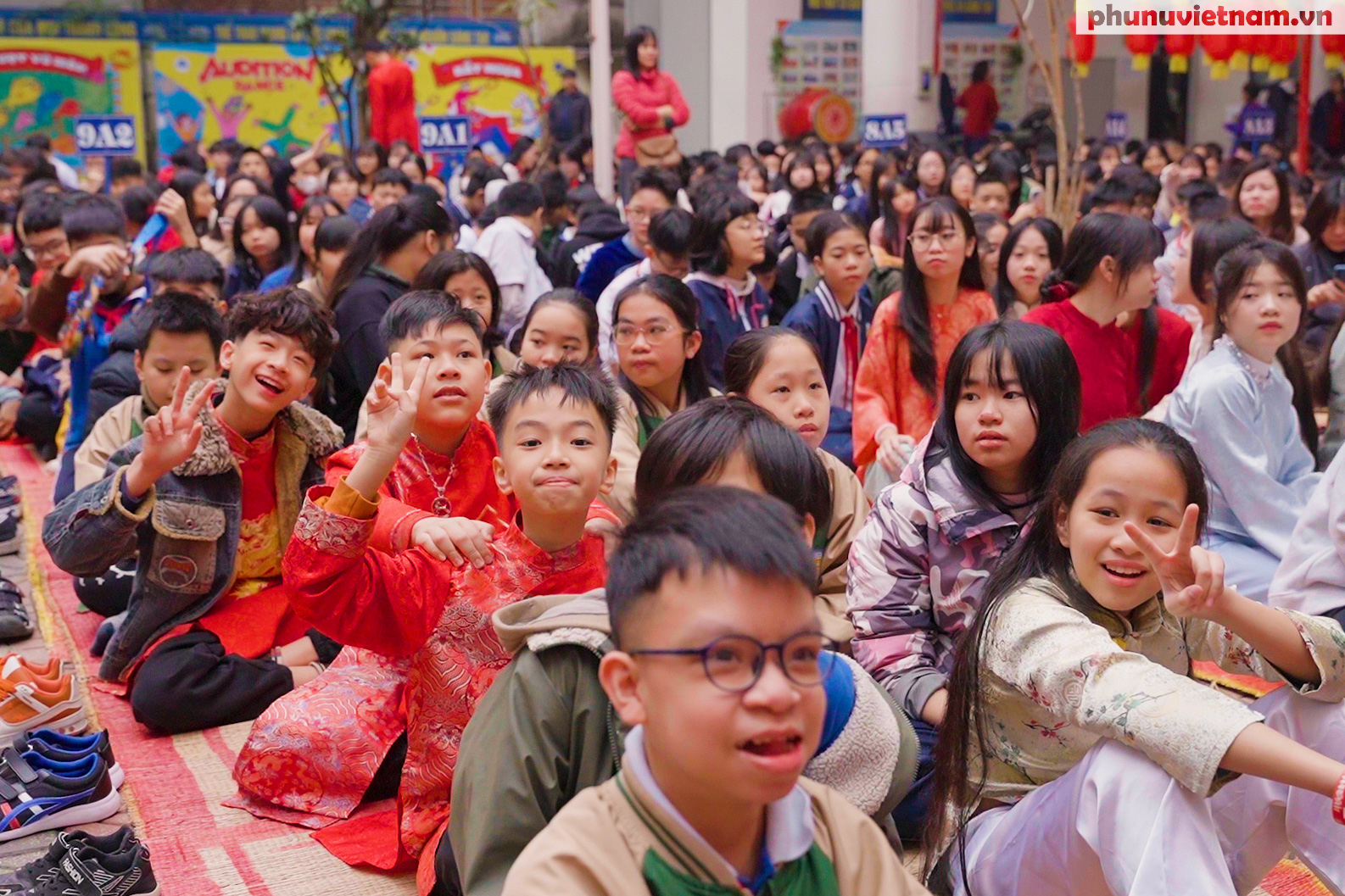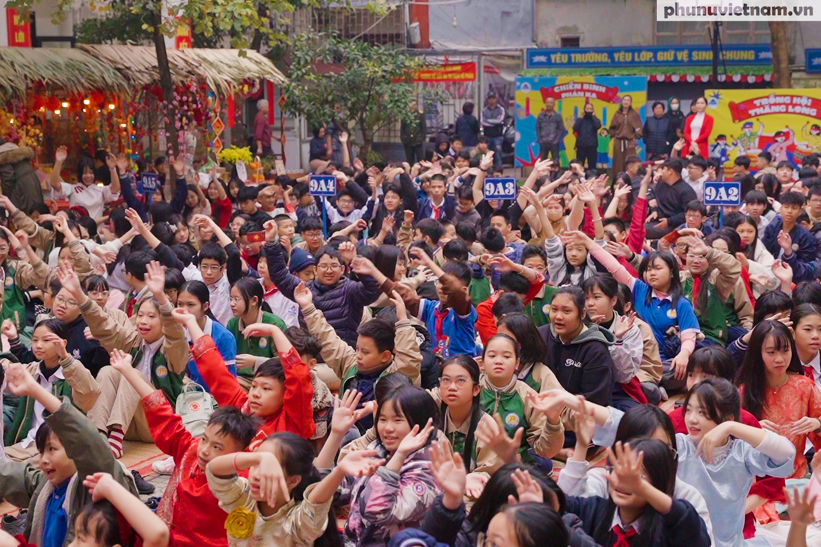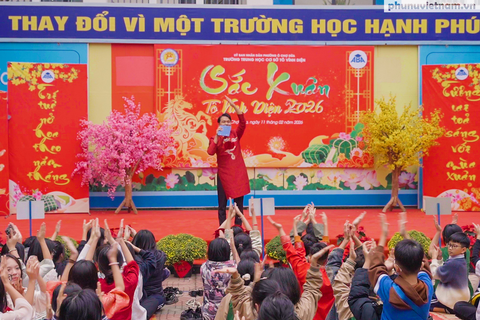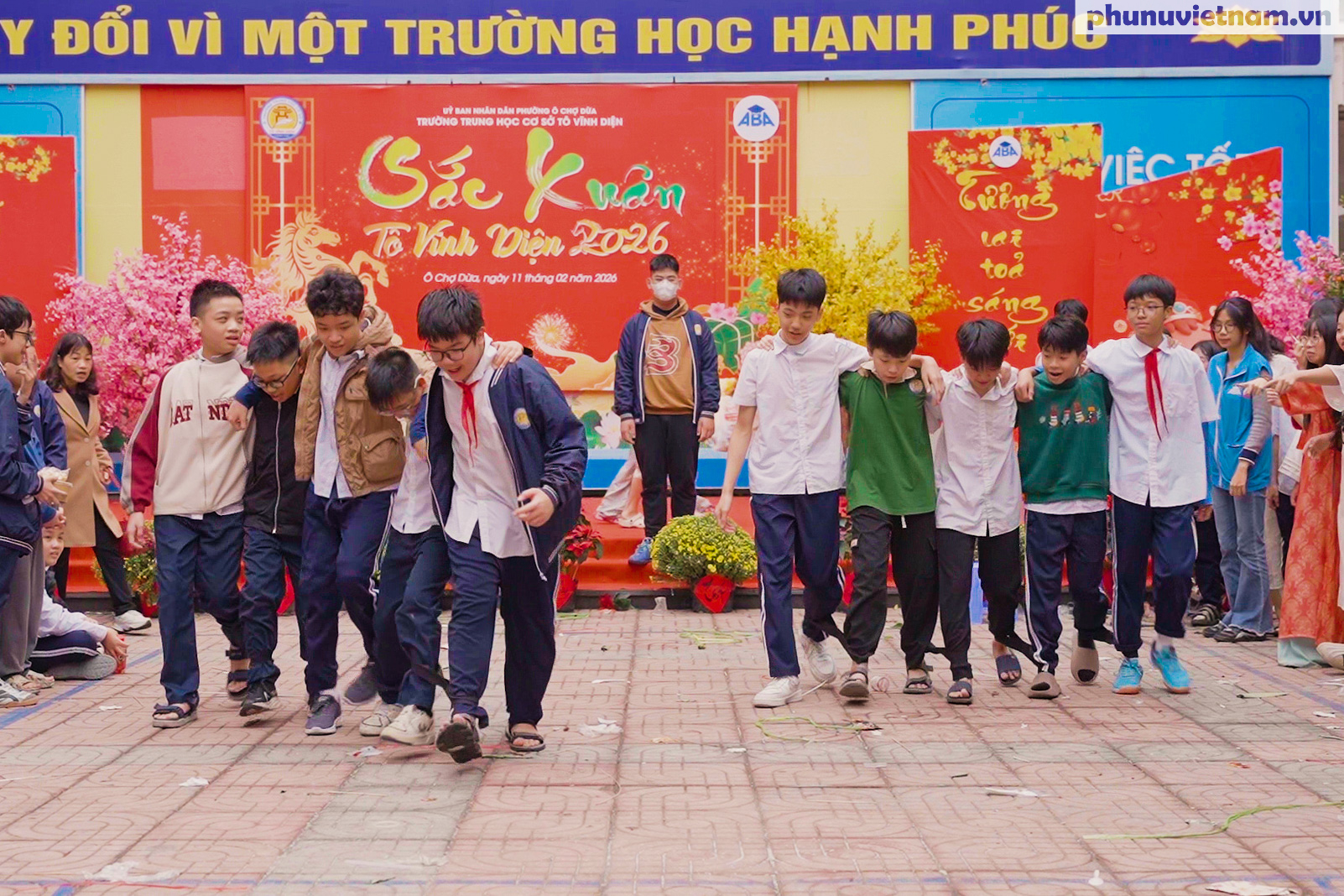 Toàn cảnh sân Trường THCS Tô Vĩnh Diện rực rỡ cờ hoa, mang đậm không khí Tết cổ truyền trong chương trình “Sắc Xuân Tô Vĩnh Diện 2026” thu hút gần 700 học sinh toàn trường tham gia.