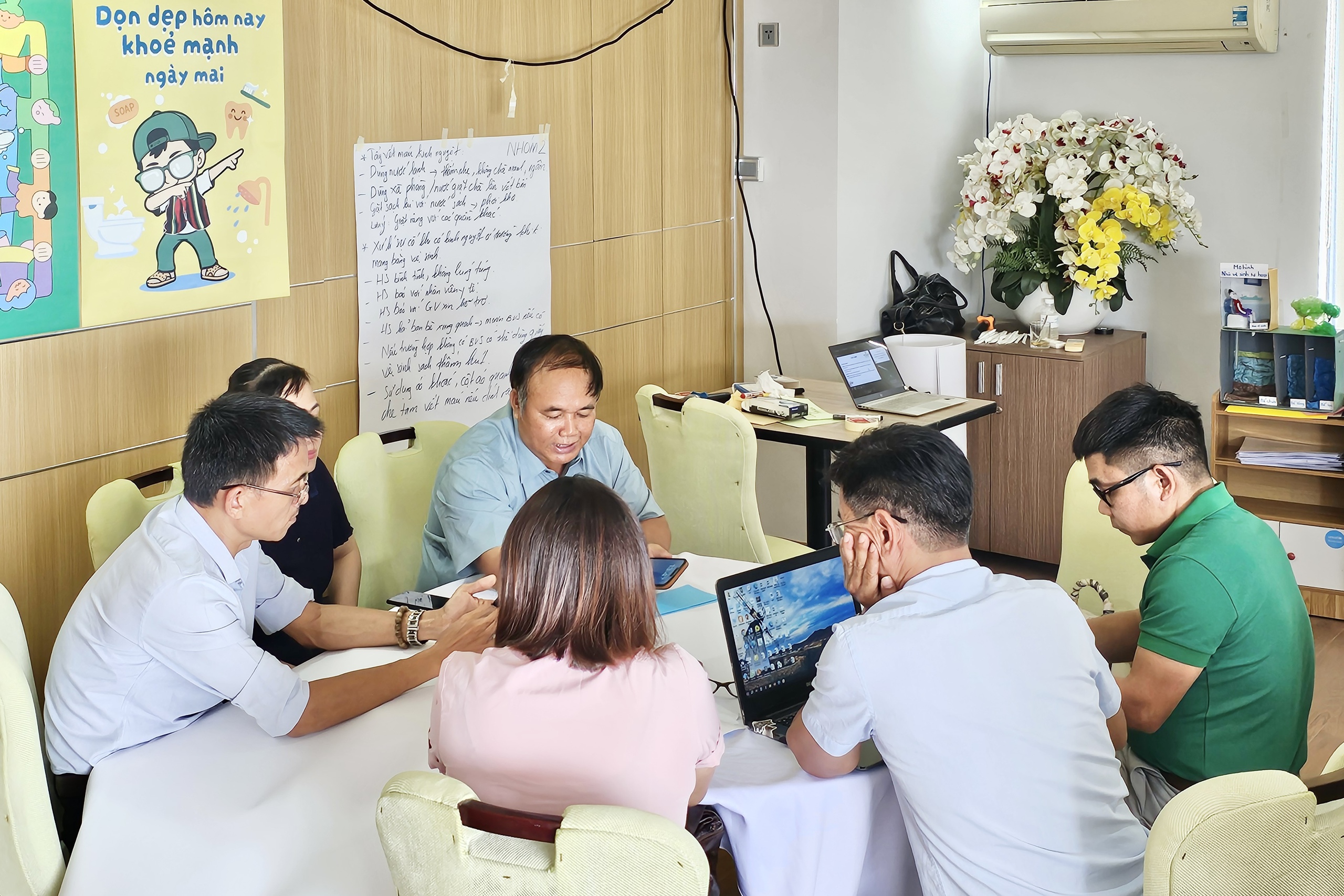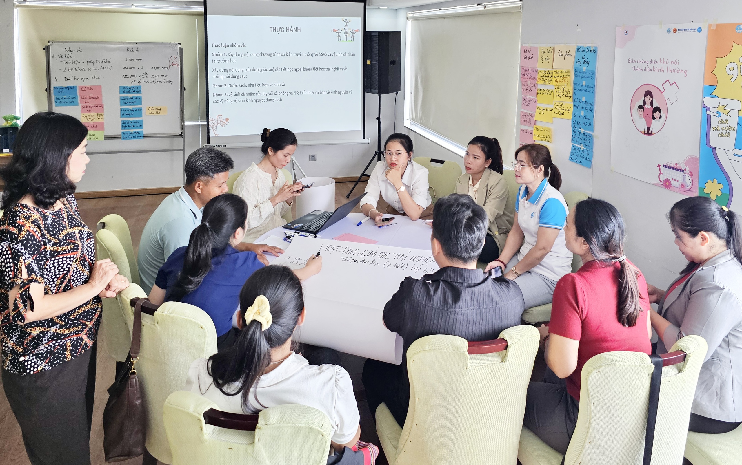 Đặc biệt, phần thực hành xây dựng nội dung cho các tiết học ngoại khóa và trải nghiệm đã diễn ra vô cùng sôi nổi. Các giáo viên đã cùng nhau thiết kế những bài giảng về "Nước sạch, nhà tiêu hợp vệ sinh và vệ sinh cá nhân" cùng "Kiến thức cơ bản về kinh nguyệt" một cách khéo léo và tế nhị. Đây vốn là những chủ đề được coi là "nhạy cảm" ở vùng đồng bào dân tộc thiểu số.