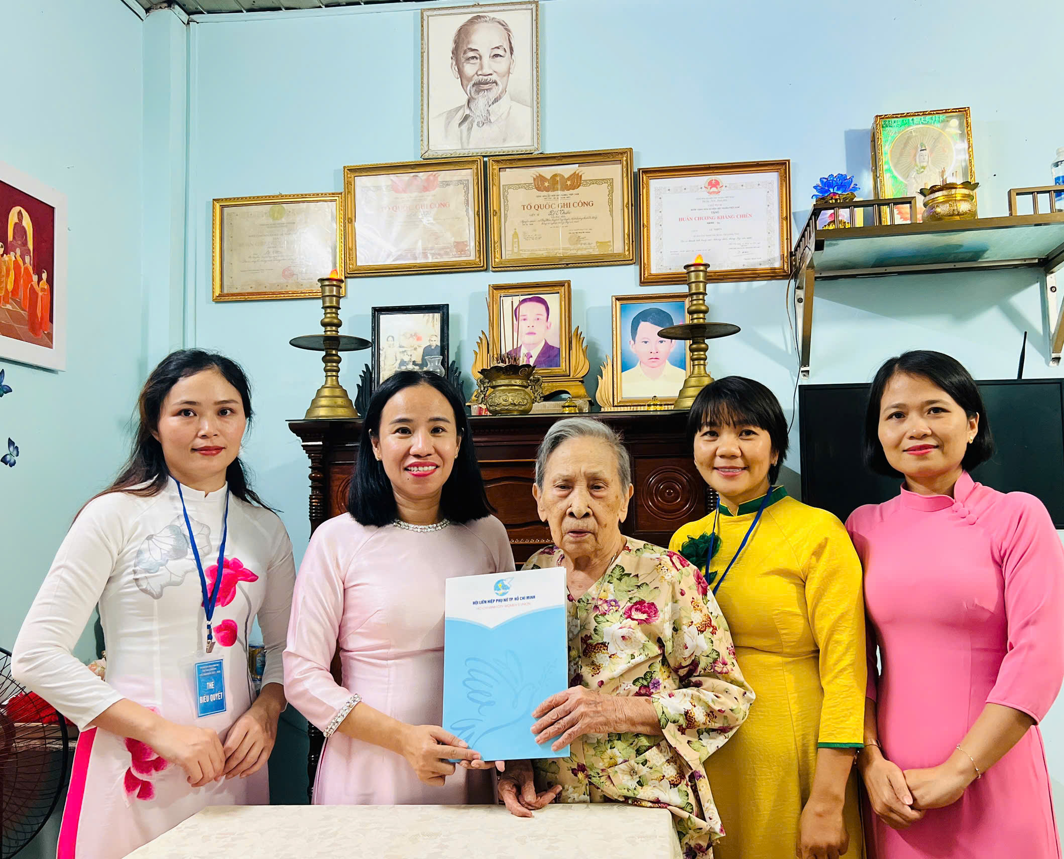 Bà Võ Ngọc Thanh Trúc - Phó Chủ tịch Ủy ban MTTQ Việt Nam Thành phố, Chủ tịch Hội LHPN TPHCM (thứ hai, từ trái sang) - thăm hỏi, tặng quà vợ liệt sĩ tại đặc khu Côn Đảo