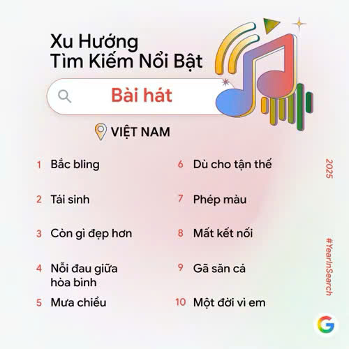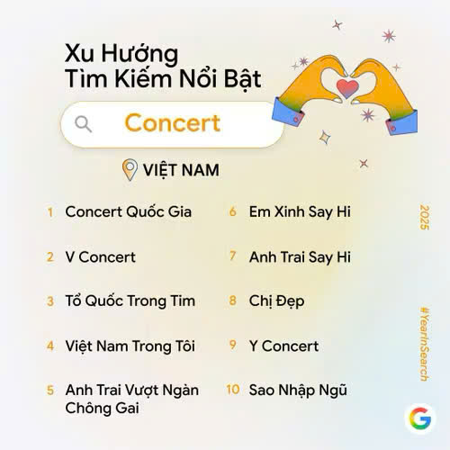 Ngày 5/12, Google công bố danh sách Year in Search 2025 bao gồm 10 chủ đề: Xu hướng chung, Tạo ảnh, Phim ảnh (chung), Phim Việt Nam, Concert, Bài hát, Tin tức, Cách làm, Là gì và Du lịch, phản ánh những xu hướng và thông tin được người Việt quan tâm và tìm kiếm nhiều nhất trong năm 2025.