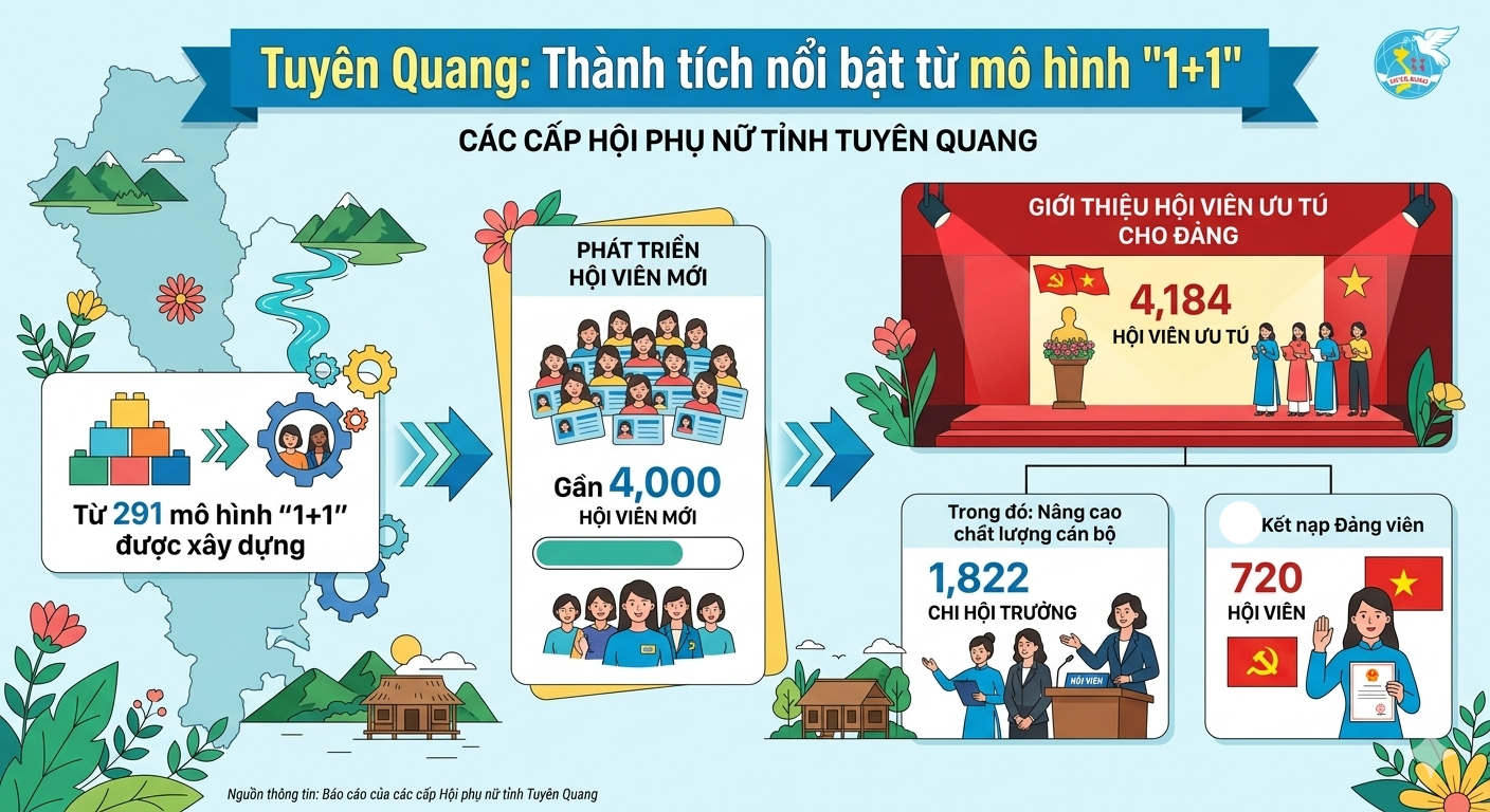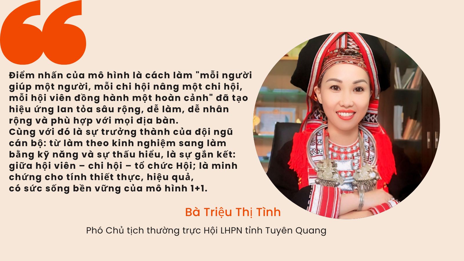 Cụ thể, tại tỉnh Tuyên Quang, bà Triệu Thị Tình, Phó Chủ tịch thường trực Hội LHPN tỉnh, chia sẻ: Xuất phát từ những khó khăn rất thực trong công tác tập hợp hội viên, đặc biệt tại địa bàn miền núi, vùng đồng bào dân tộc thiểu số, Hội LHPN tỉnh Tuyên Quang đã lựa chọn mô hình "1+1" cách làm sáng tạo, linh hoạt, góp phần tháo gỡ "nút thắt" trong hoạt động Hội ở cơ sở, đặc biệt tại địa bàn miền núi, vùng đồng bào dân tộc thiểu số; đồng thời mở ra hướng đi mới trong nâng cao chất lượng cán bộ Hội cơ sở.