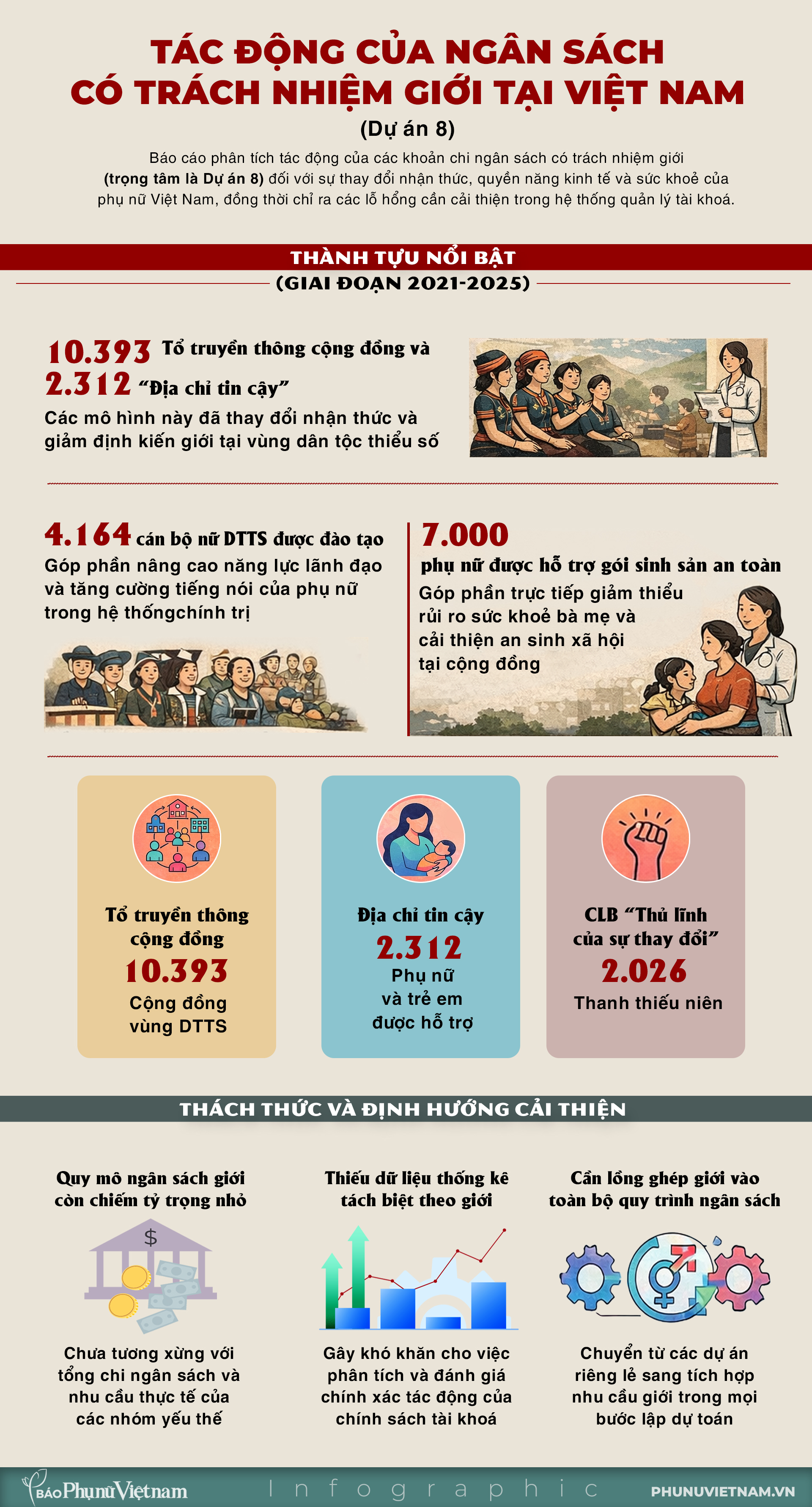 Bên cạnh đó, trong giai đoạn 2021-2025, cả nước có 3 chương trình mục tiêu quốc gia. Theo các nghị quyết của Quốc hội2, tổng nguồn lực dự kiến khoảng 409.000 tỷ đồng (chiếm khoảng 3-3,5% tổng chi ngân sách), Chương trình mục tiêu quốc gia phát triển vùng dân tộc thiểu số và miền núi giai đoạn 2021-2030 có nguồn lực chiếm khoảng 1/3 với trên 137.000 tỷ đồng, trong đó Dự án 8 "Thực hiện bình đẳng giới và giải quyết các vấn đề cấp thiết đối với phụ nữ và trẻ em" giai đoạn I (2021-2025) do TƯ Hội LHPN Việt Nam chủ trì có nguồn ngân sách lớn nhất với 1.994,8 tỷ đồng, trong đó ngân sách trung ương chiếm 1.962,4 tỷ đồng, ngân sách địa phương là 32,4 tỷ đồng3.