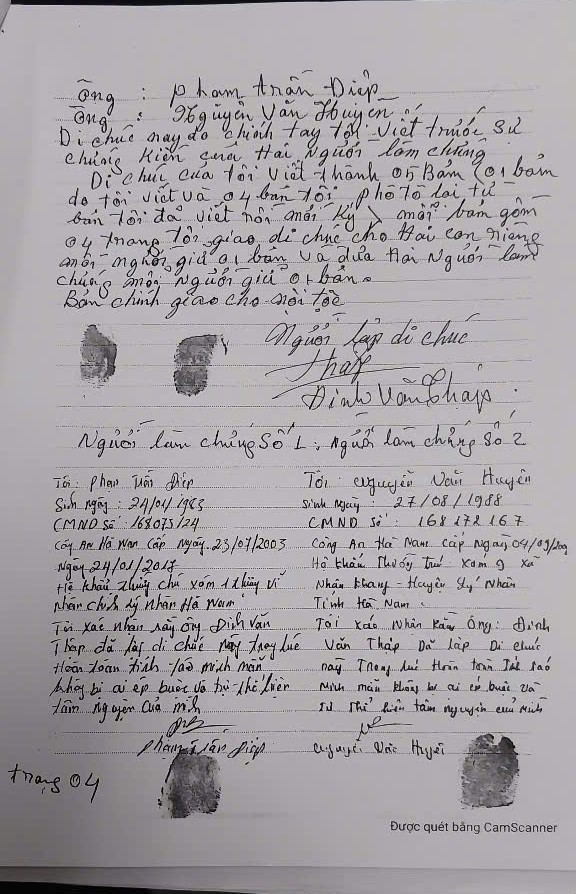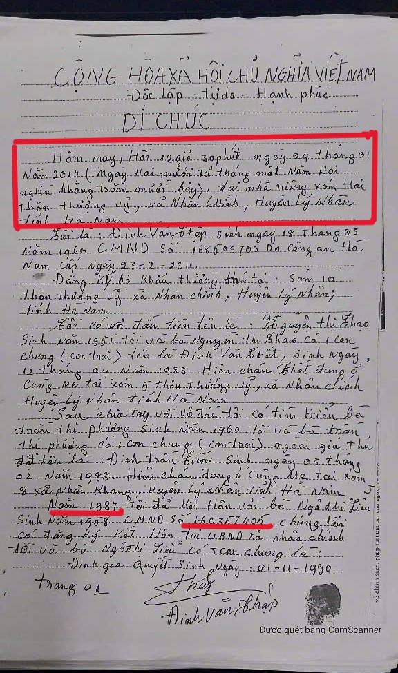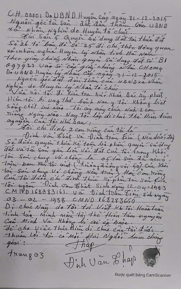 Cán bộ Tư pháp xã Nhân Chính thời điểm đó là ông Nguyễn Tiến Đề, đã công bố bản di chúc do ông Đinh Văn Thập để lại. Theo di chúc công bố, ông Thập để lại toàn bộ phần tài sản của mình trong cho 02 người con riêng là anh Đinh Văn Thất và Đinh Trần Tiến.