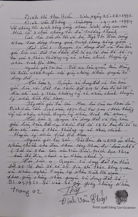 Ngoài ra, bà Liễu cũng cho rằng, thời điểm đó ông Đinh Văn Thất vẫn giữ 02 giấy chứng nhận quyền sử dụng đất của gia đình bà mang tên ông Đinh Văn Thập, đó là thửa đất số 261 tờ bản đồ 16; diện tích 261m2 (nay là thửa đất số 219 tờ bản đồ số 15), có địa chỉ tại xóm 2 Thượng Vỹ, xã Nhân Chính, và thửa đất số 25 tờ bản đồ 25; diện tích 172,0m2, ở xã Nhân Nghĩa, nay là xã Trần Thương, tỉnh Ninh Bình.