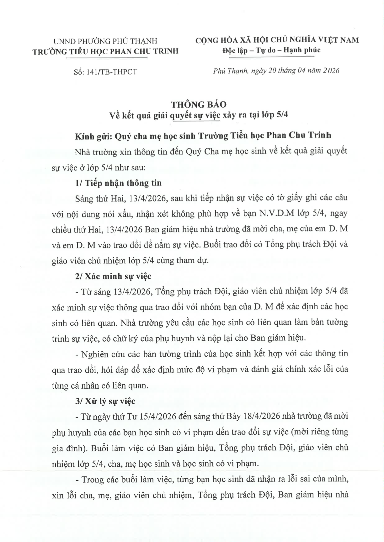 Hiệu trưởng cho biết ngay khi tiếp nhận thông tin, nhà trường đã làm việc với các bên liên quan, động viên học sinh bị ảnh hưởng ổn định tâm lý, đồng thời chỉ đạo giáo viên chủ nhiệm theo dõi, hỗ trợ em trong quá trình học tập và sinh hoạt. Nhà trường cũng sẵn sàng đáp ứng nguyện vọng chuyển lớp nếu học sinh có nhu cầu.