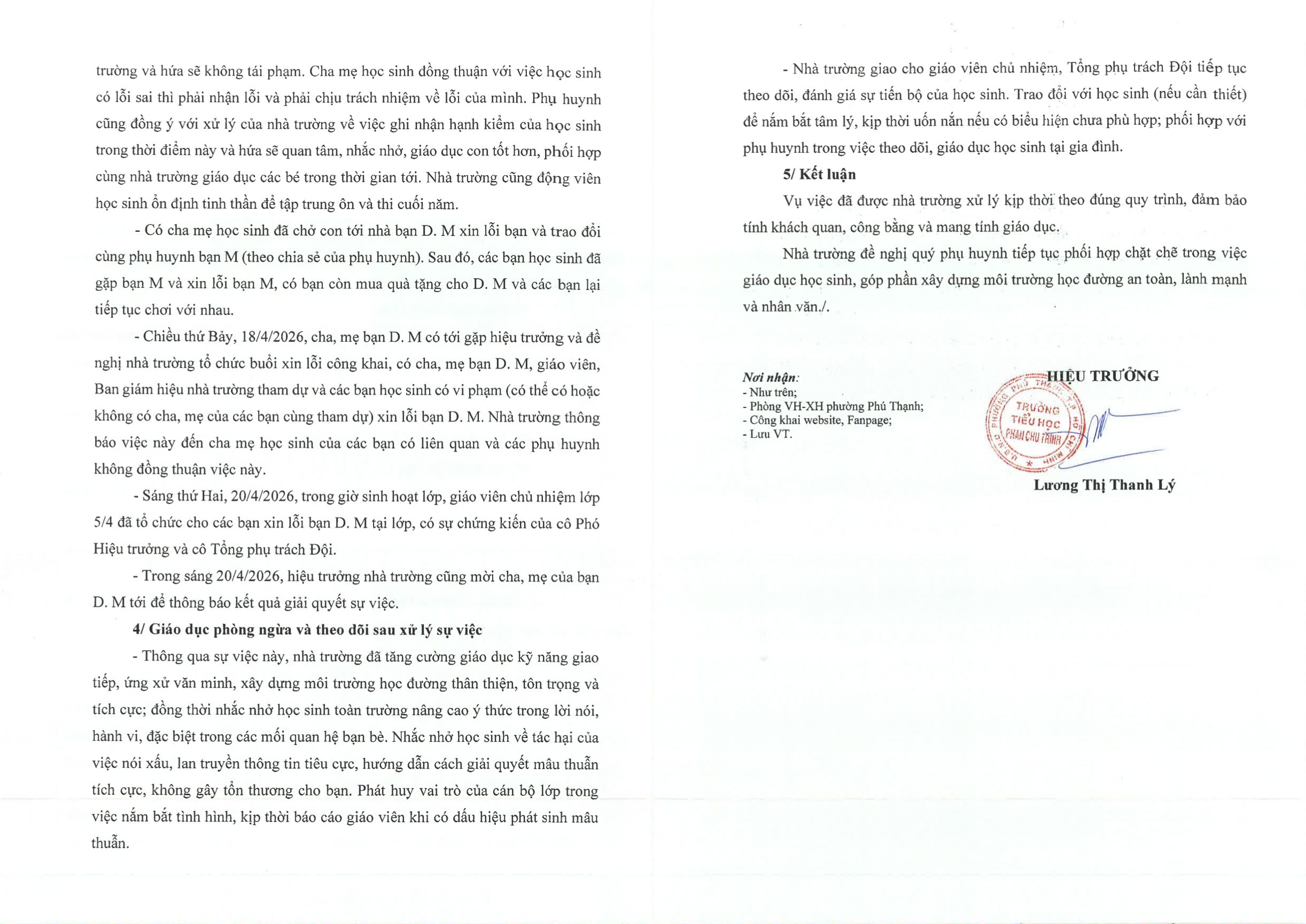 Liên quan đến nội dung công khai tên học sinh bị ảnh hưởng trong văn bản, bà Lý thừa nhận đây là "sơ suất của nhà trường" và khẳng định không có chủ đích. "Nhà trường sẽ ban hành văn bản thay thế, đồng thời xin lỗi phụ huynh về thiếu sót này", bà nói.