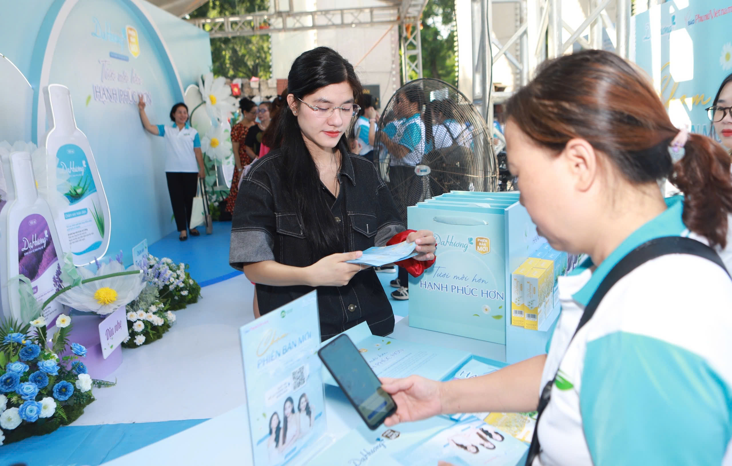 Sự kiện quy tụ hơn 60 gian hàng giới thiệu các sản phẩm OCOP, ẩm thực, dịch vụ an toàn, thân thiện với môi trường. Phó Chủ tịch Hội LHPN Việt Nam Nguyễn Thị Thu Hiền trò chuyện cùng đại diện gian hàng