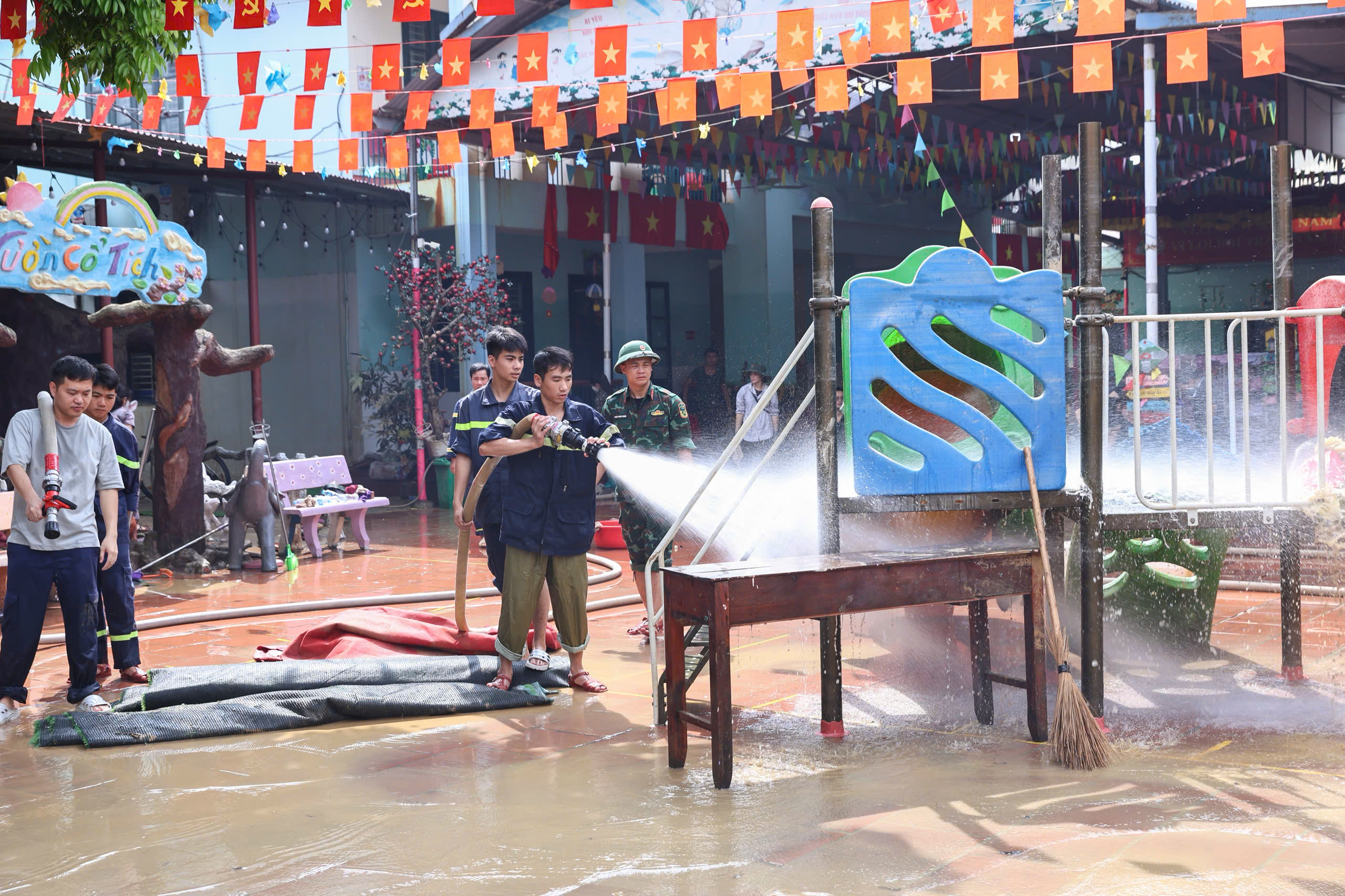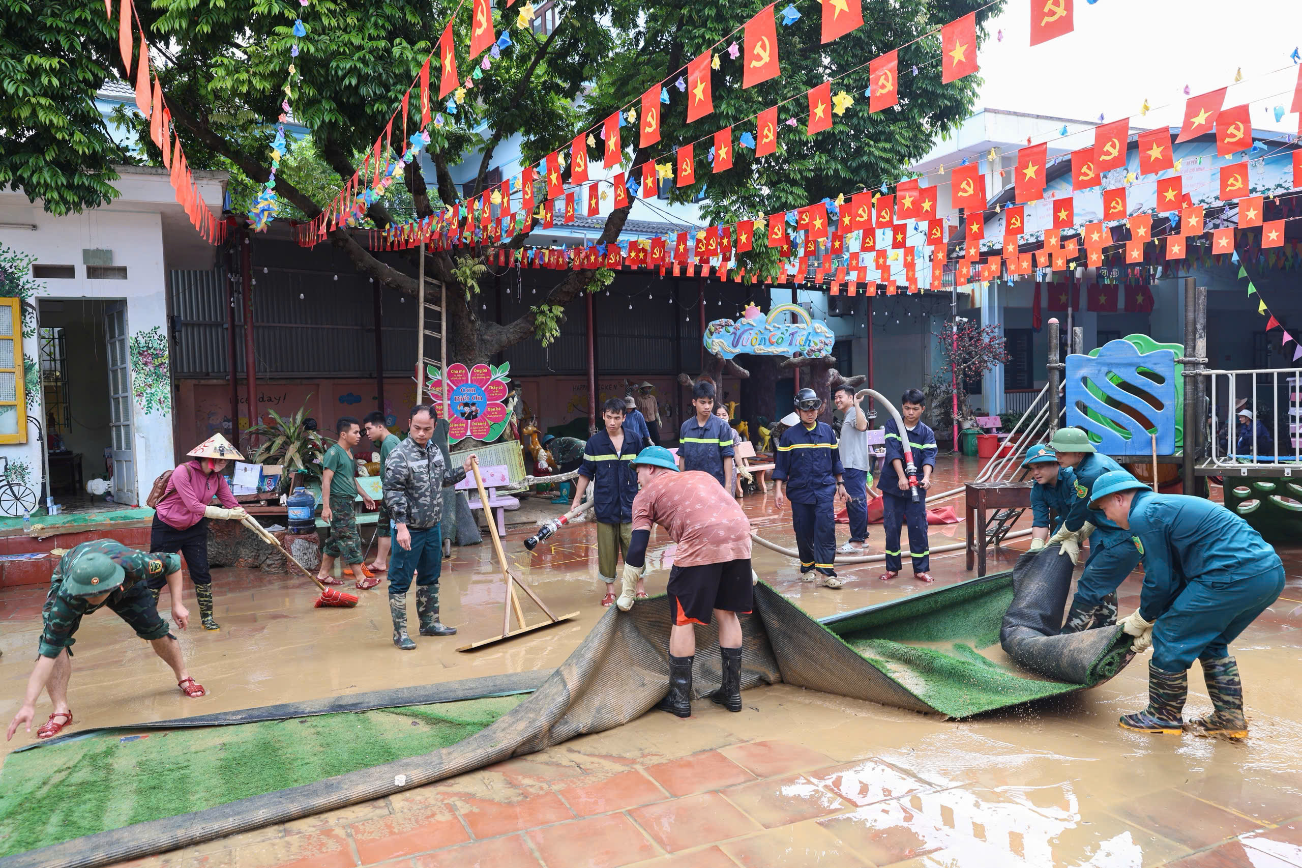 Phó Chủ tịch Hà Thị Nga tới thăm và động viên thầy cô cùng các lực lượng đang hỗ trợ dọn dẹp trường mầm non Gia Sàng, tỉnh Thái Nguyên