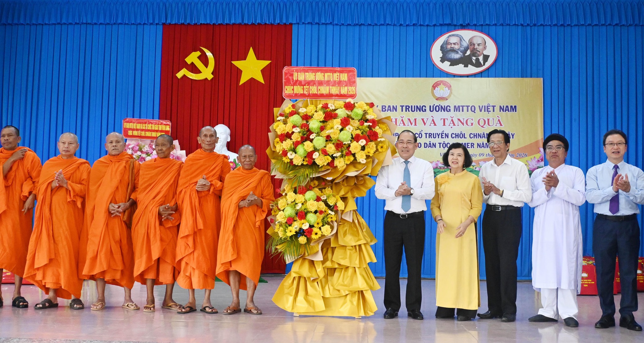 Trước thềm ngày lễ lớn của đồng bào Khmer, Đoàn công tác của Ủy ban Trung ương MTTQ Việt Nam do Phó Chủ tịch Ủy ban Trung ương MTTQ Việt Nam Hoàng Công Thủy làm trưởng đoàn đã đến thăm và tặng 50 phần quà đến các vị chức sắc, chức việc, Achar, người có uy tín của Hội đoàn kết sư sãi yêu nước tỉnh Vĩnh Long; tặng 100 phần quà đến các gia đình đồng bào Khmer nghèo, gia đình chính sách tại tỉnh Vĩnh Long.