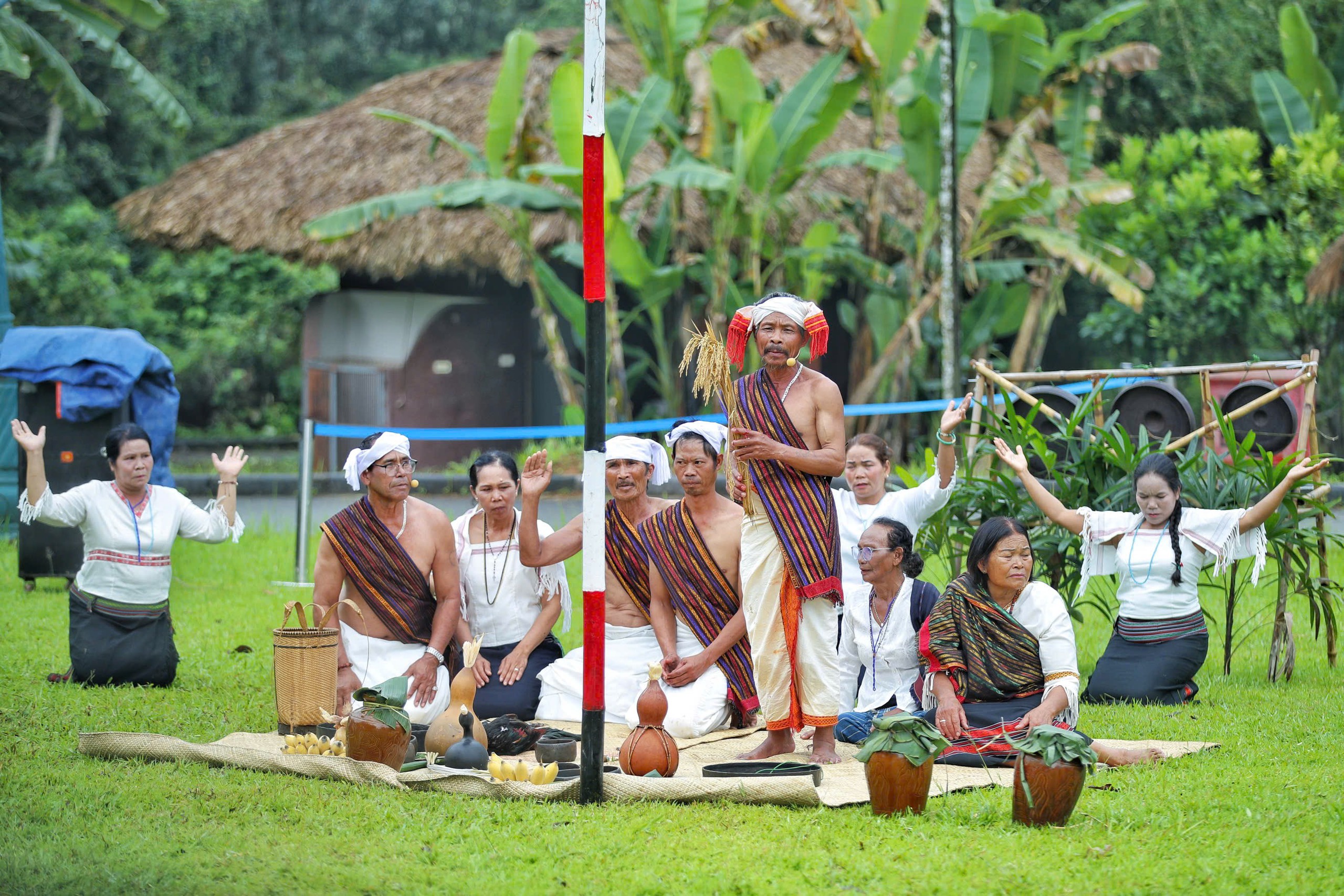 Nghi lễ được tái hiện tại sự kiện theo đúng trình tự truyền thống. Mở đầu là phần dâng lễ với các vật phẩm quen thuộc như cơm mới, rượu cần, lúa và gia súc (gà hoặc heo), thể hiện thành quả lao động và lòng thành kính của con người đối với thần linh. Tiếp đó là nghi thức hiến lễ, trong đó máu của vật hiến được sử dụng để bôi lên cây nêu trước khi dựng, như một cách kết nối giữa thế giới con người và thần linh.