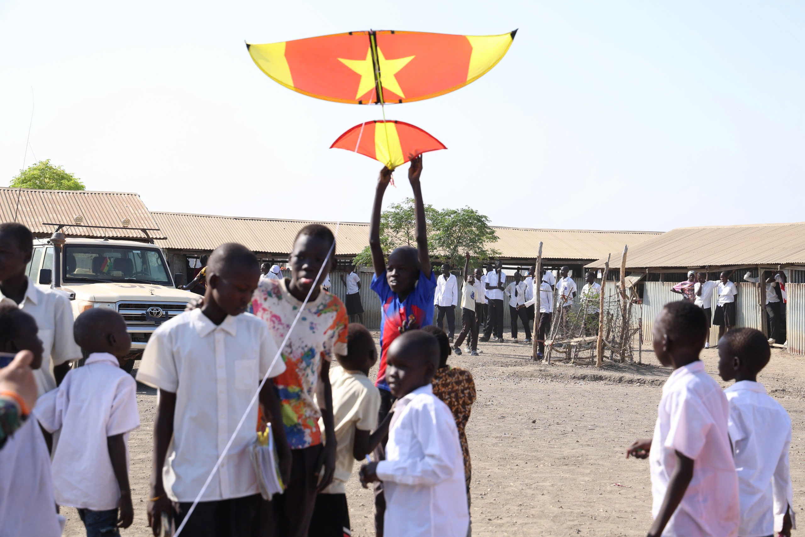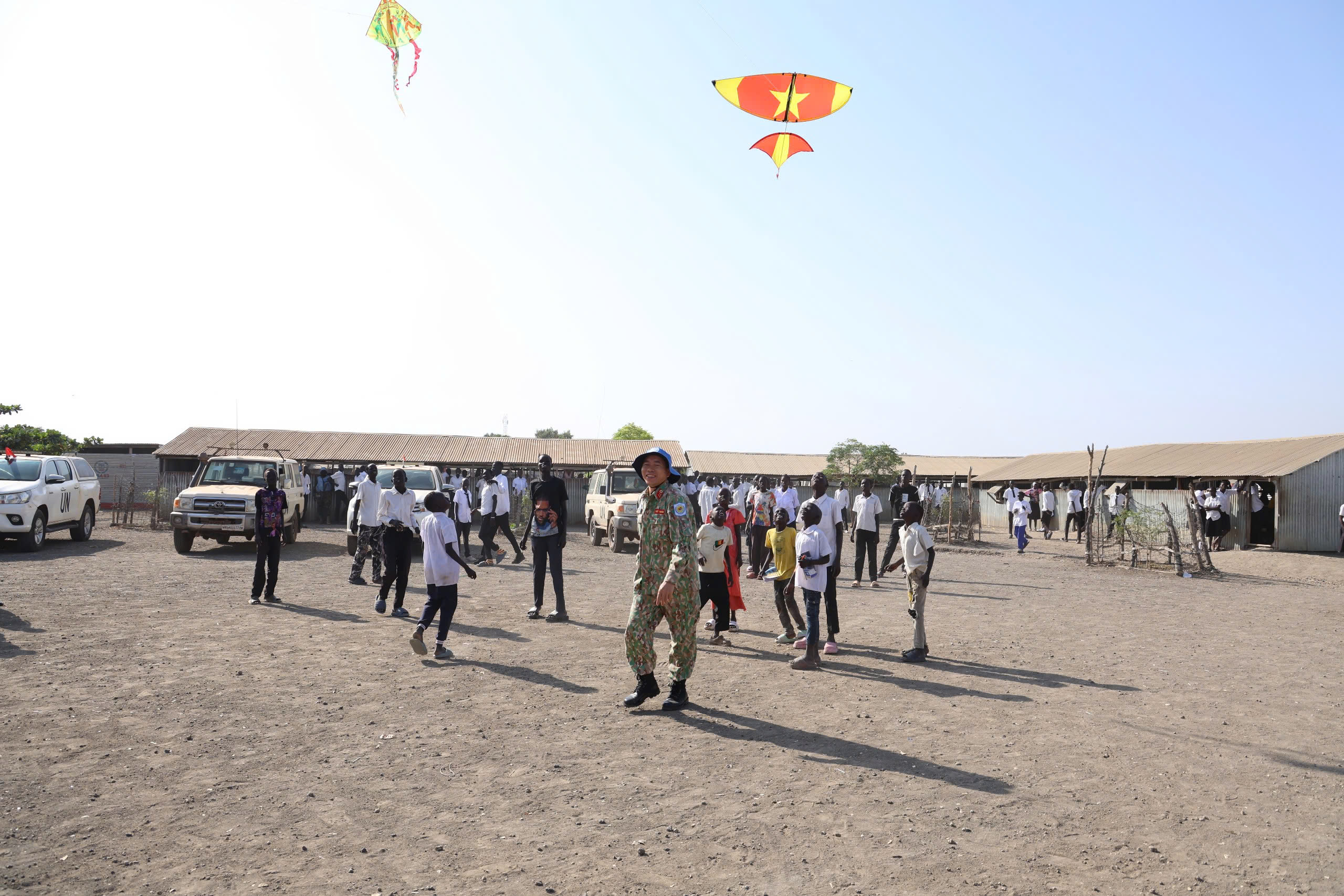 Các chiến sĩ gìn giữ hoà bình Việt Nam dạy các em chơi diều, rồi cùng các em chạy trên sân trường thả diều. Ảnh: Cục GGHB