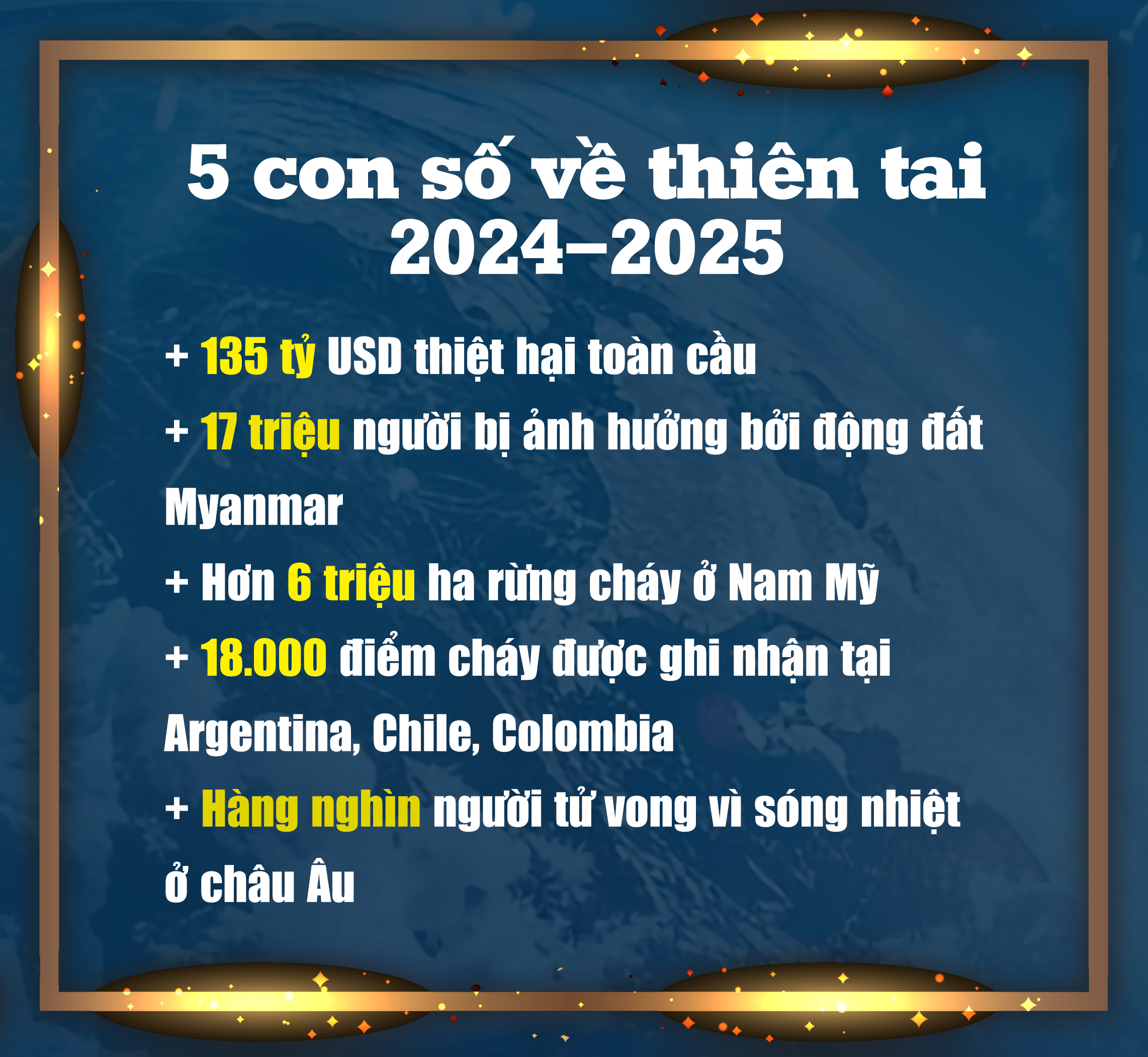 Năm 2025 ghi nhận chuỗi thảm họa thiên nhiên khốc liệt với tổng thiệt hại ước tính khoảng 135 tỷ USD trên toàn cầu (theo Viện nghiên cứu Swiss Re, Thụy Sĩ). Tại châu Á, trận động đất 7,7 độ Richter ở Myanmar lan chấn sang Thái Lan, Ấn Độ, Trung Quốc, gây thiệt hại khoảng 11 tỷ USD và ảnh hưởng đến khoảng 17 triệu người. Bên cạnh đó, một loạt quốc gia Đông và Nam Á như Hàn Quốc, Pakistan phải gồng mình trước lũ lớn, sạt lở đất và cháy rừng kéo dài.
