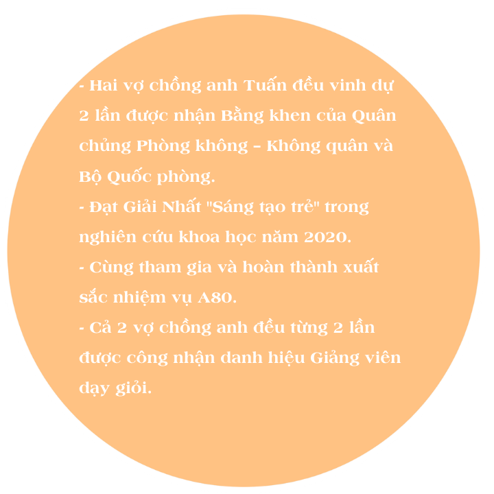 Cả hai bên nội, ngoại, nhiều người thân của anh chị đã và đang phục vụ trong quân ngũ. Đặc biệt, bố đẻ và bố vợ anh Tuấn đều là cựu chiến binh, trong đó bố vợ anh - Đại tá Phạm Văn Át - nguyên là chiến sĩ thuộc tiểu đoàn tên lửa, từng tham gia chiến đấu và cùng đơn vị bắn hạ máy bay B52 trên bầu trời Hà Nội. Những truyền thống ấy như một mạch nguồn bền bỉ, nuôi dưỡng và tiếp nối trong chính hành trình của hai vợ chồng hôm nay.