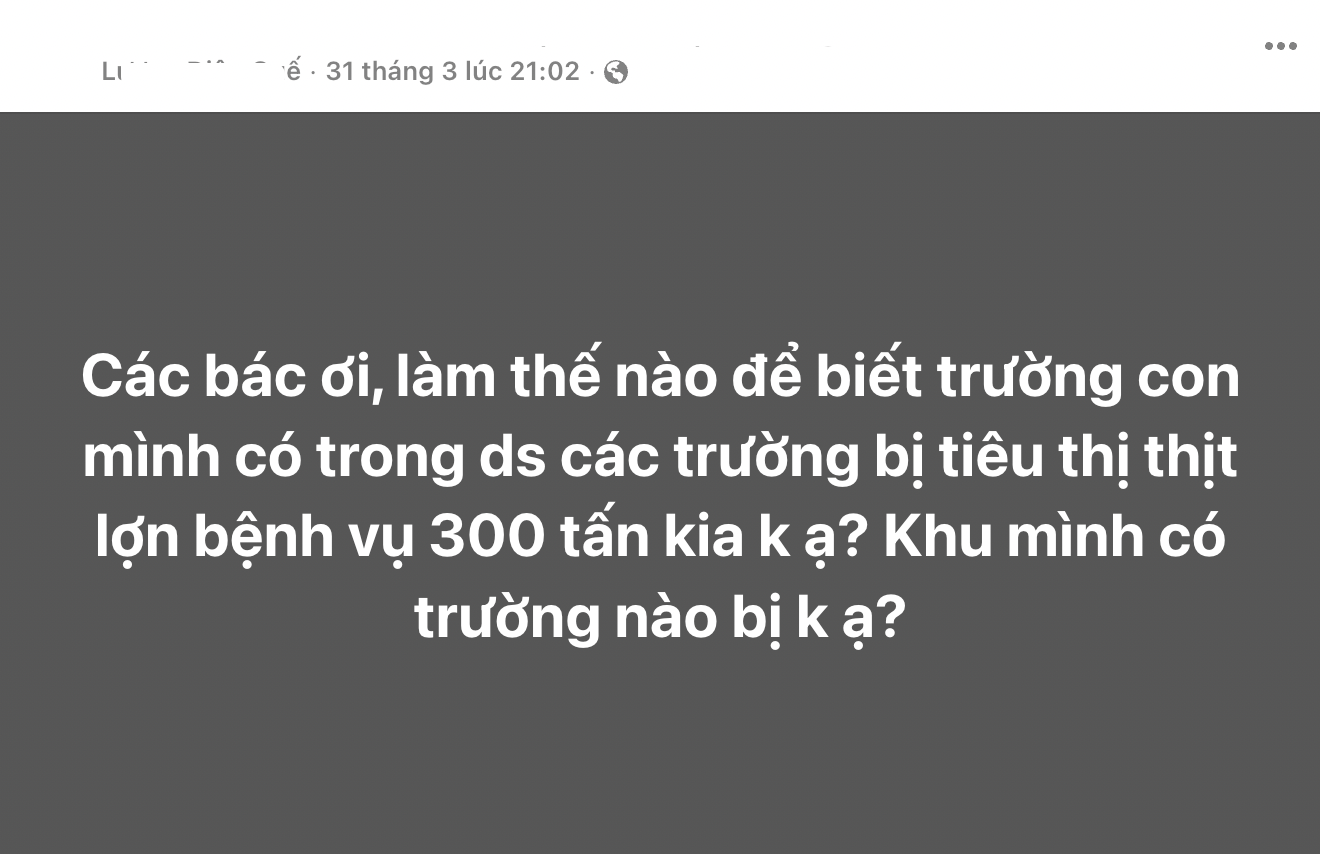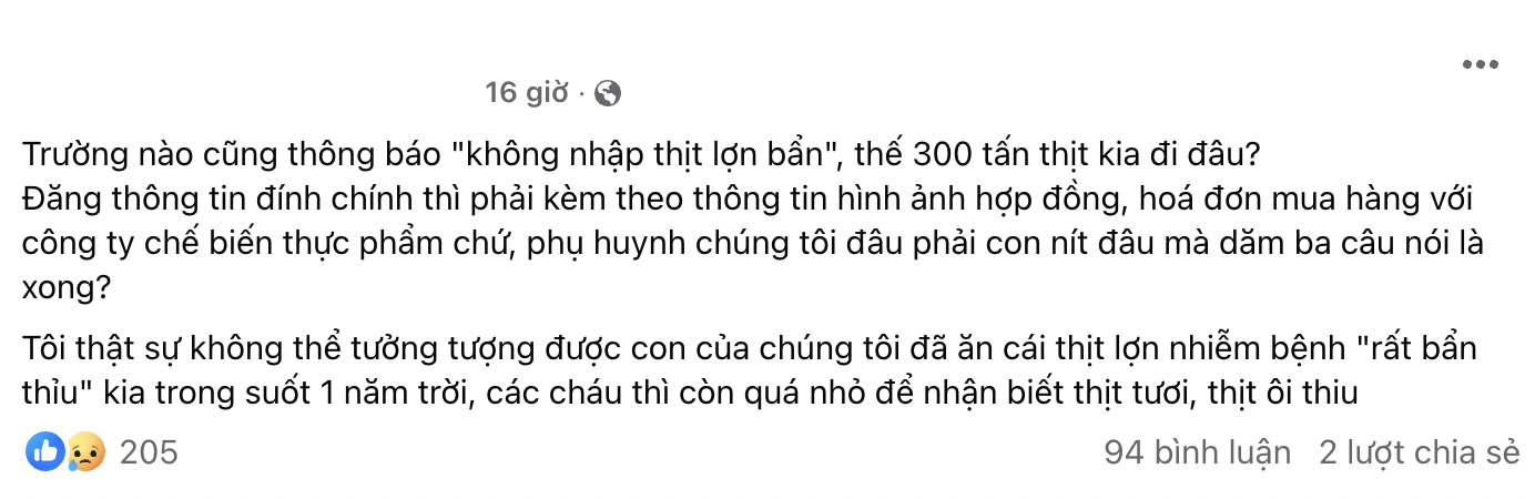 Điều khiến nhiều phụ huynh băn khoăn lúc này không chỉ nằm ở phần lớn nguồn cung đã được công bố, mà còn ở phần còn lại chưa được làm rõ: Số thịt lợn ngoài 97% nói trên đã được nhập từ đâu, được phân phối cho những đơn vị nào và cuối cùng đã đi vào những bữa ăn nào?