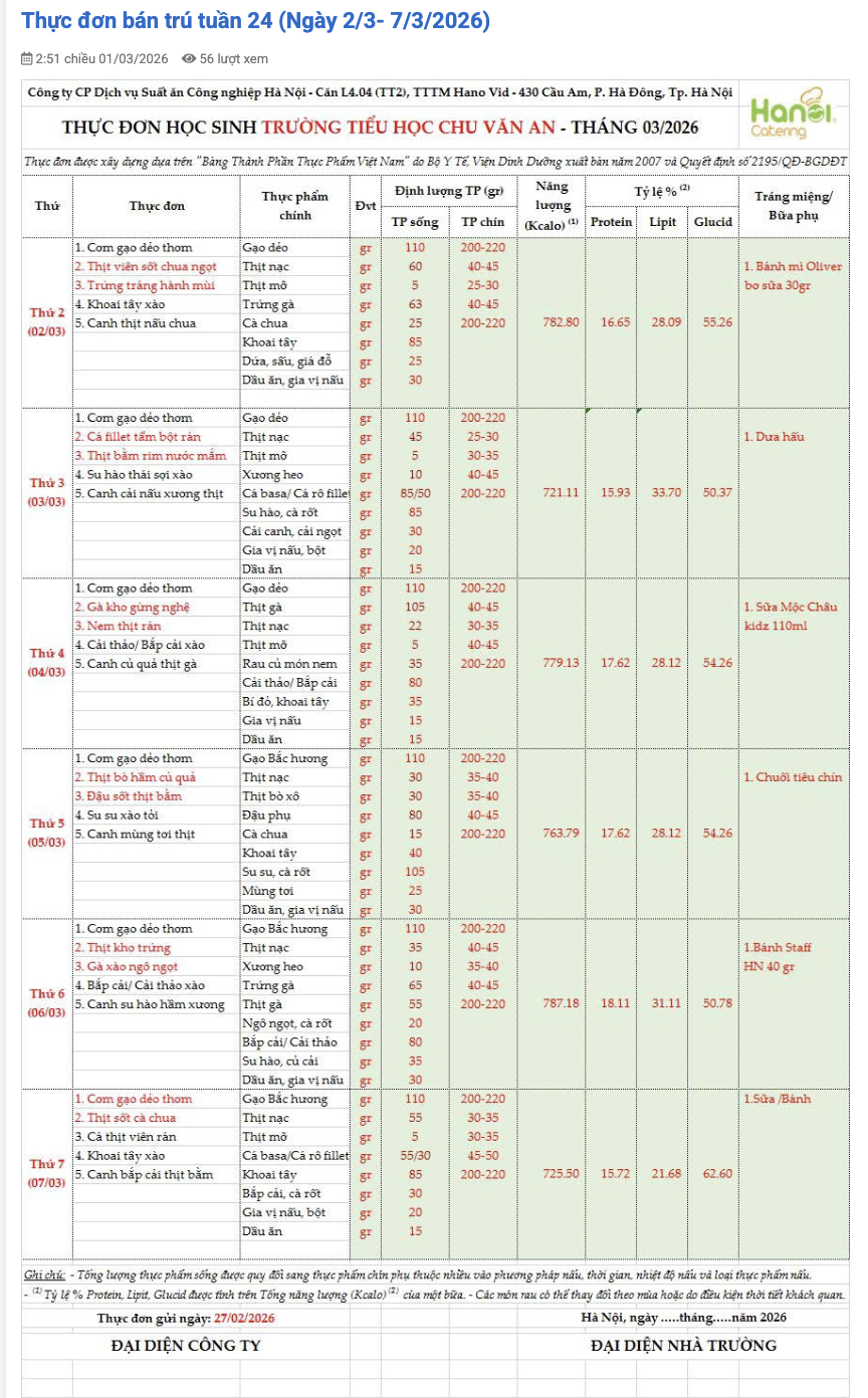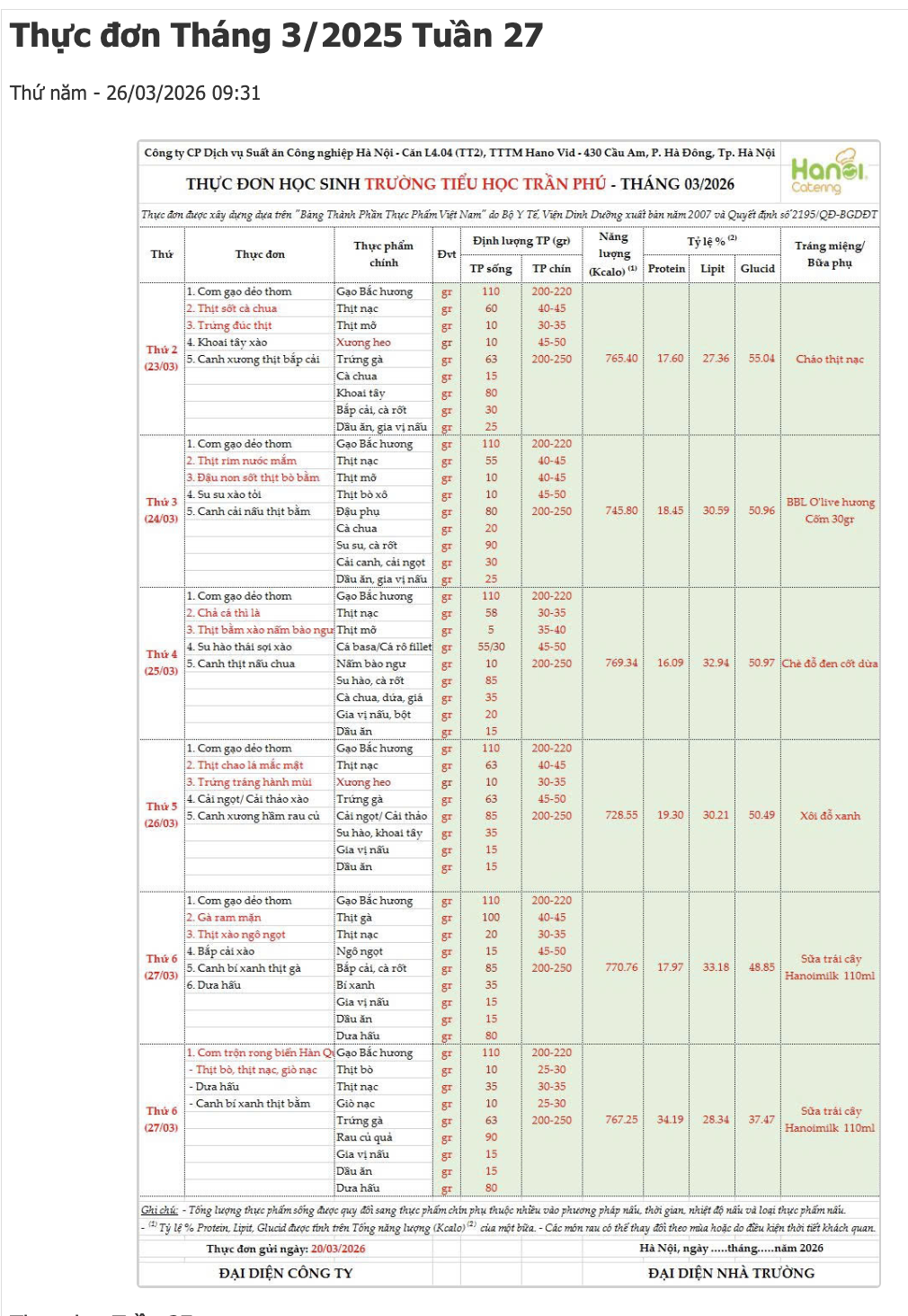 Thực đơn một số trường Tiểu học trên địa bàn thành phố có hợp đồng cung cấp suất ăn với Công ty CP Dịch vụ Suất ăn công nghiệp Hà Nội. Ảnh: Chụp màn hình.